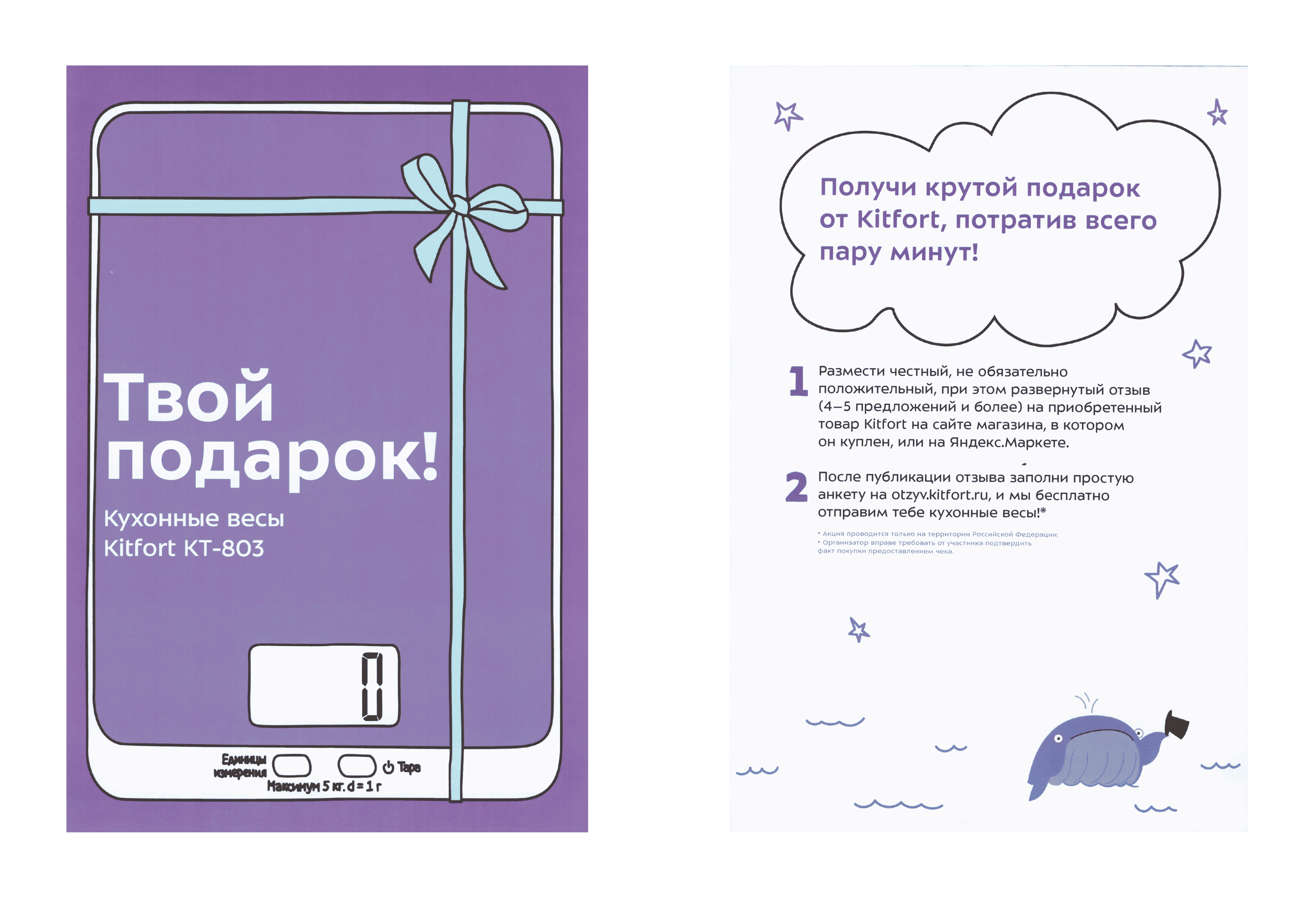 Компания Kitfort кладет в упаковку с товаром буклет, в котором просит разместить отзыв о купленном продукте. Взамен фирма высылает подарок — кухонные весы