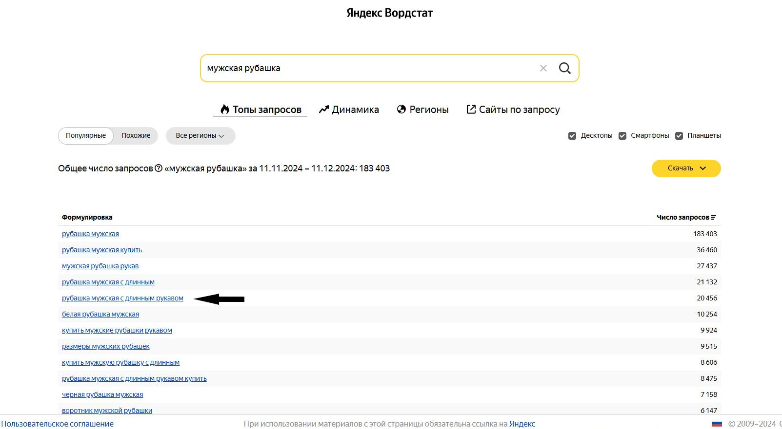 Например, при запросе мужская рубашка сервис , что много пользователей ищут рубашку с длинным рукавом, поэтому в названии и описании карточки товара стоит упомянуть про длинный рукав