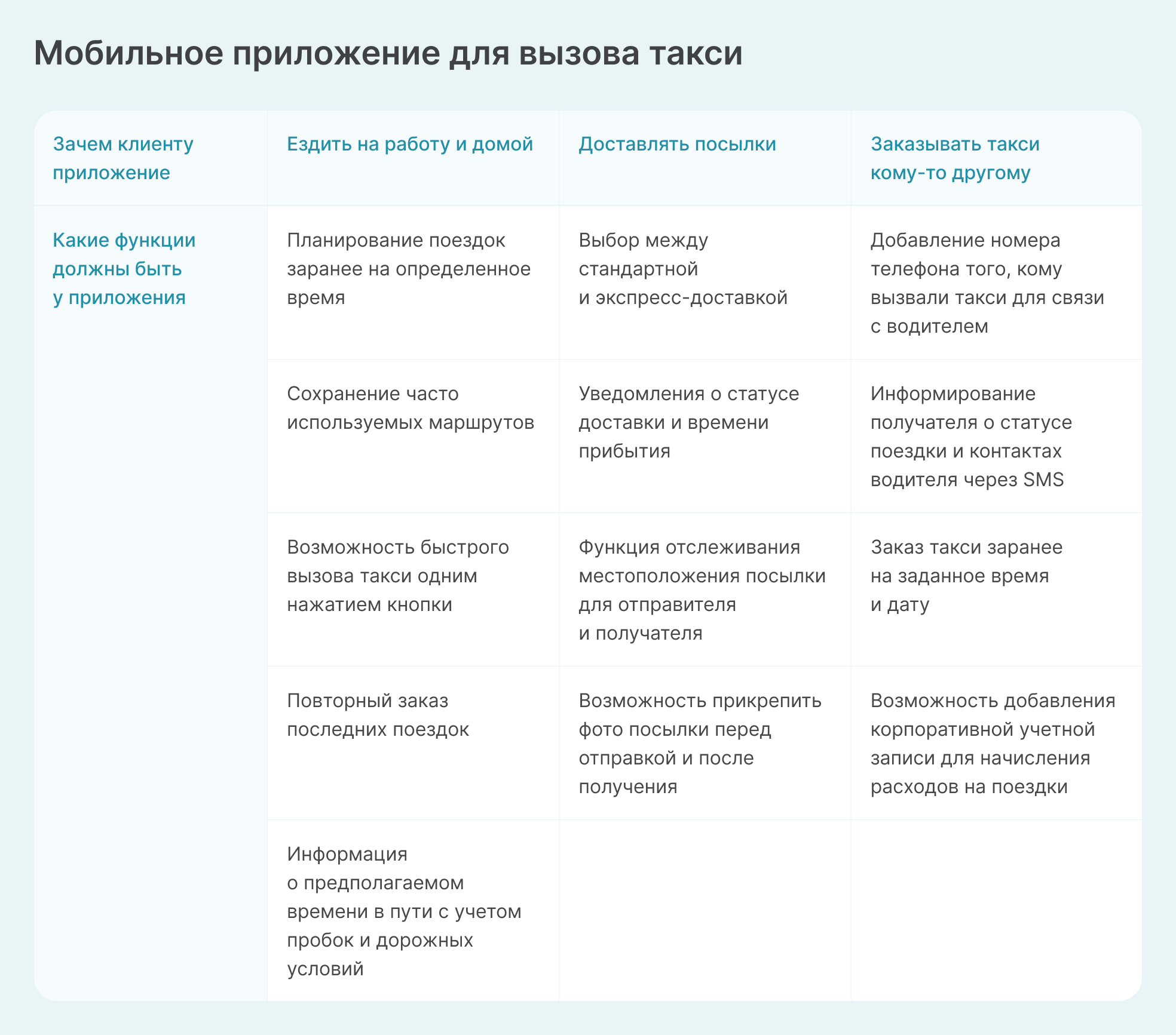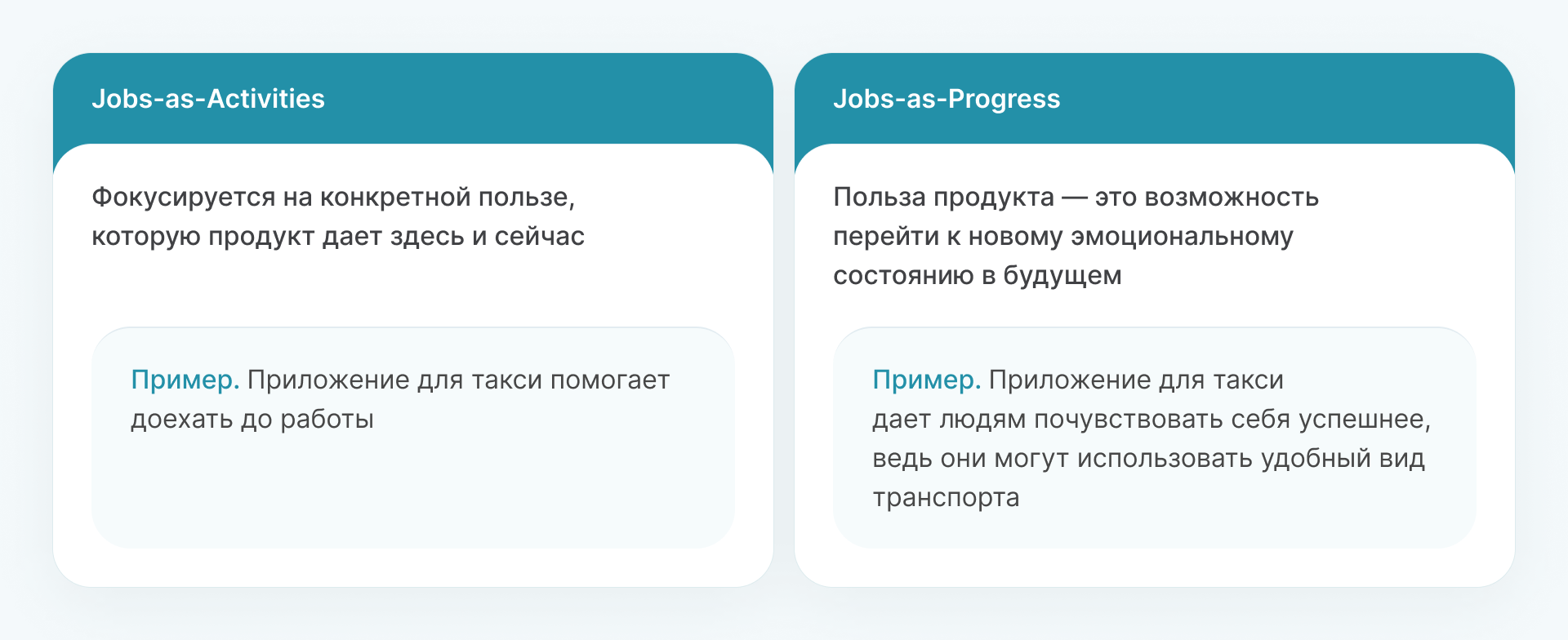 Jobs To Be Done: пример. Представим, что компания разрабатывает мобильное приложение для вызова такси. Какая-то часть пользователей использует его, чтобы на такси ездить из дома на работу и обратно. Кто-то через приложение доставляет посылки, а кто-то заказывает трансфер клиентам.