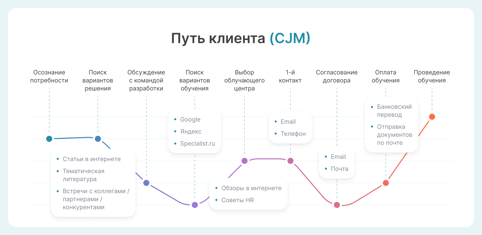 Customer Journey Map. С помощью Customer Journey Map удается изучить путь пользователя от момента осознания потребности до покупки или скачивания продукта. С помощью такой карты получается увидеть действия клиентов, которые он совершает при выборе сервиса или услуги.
