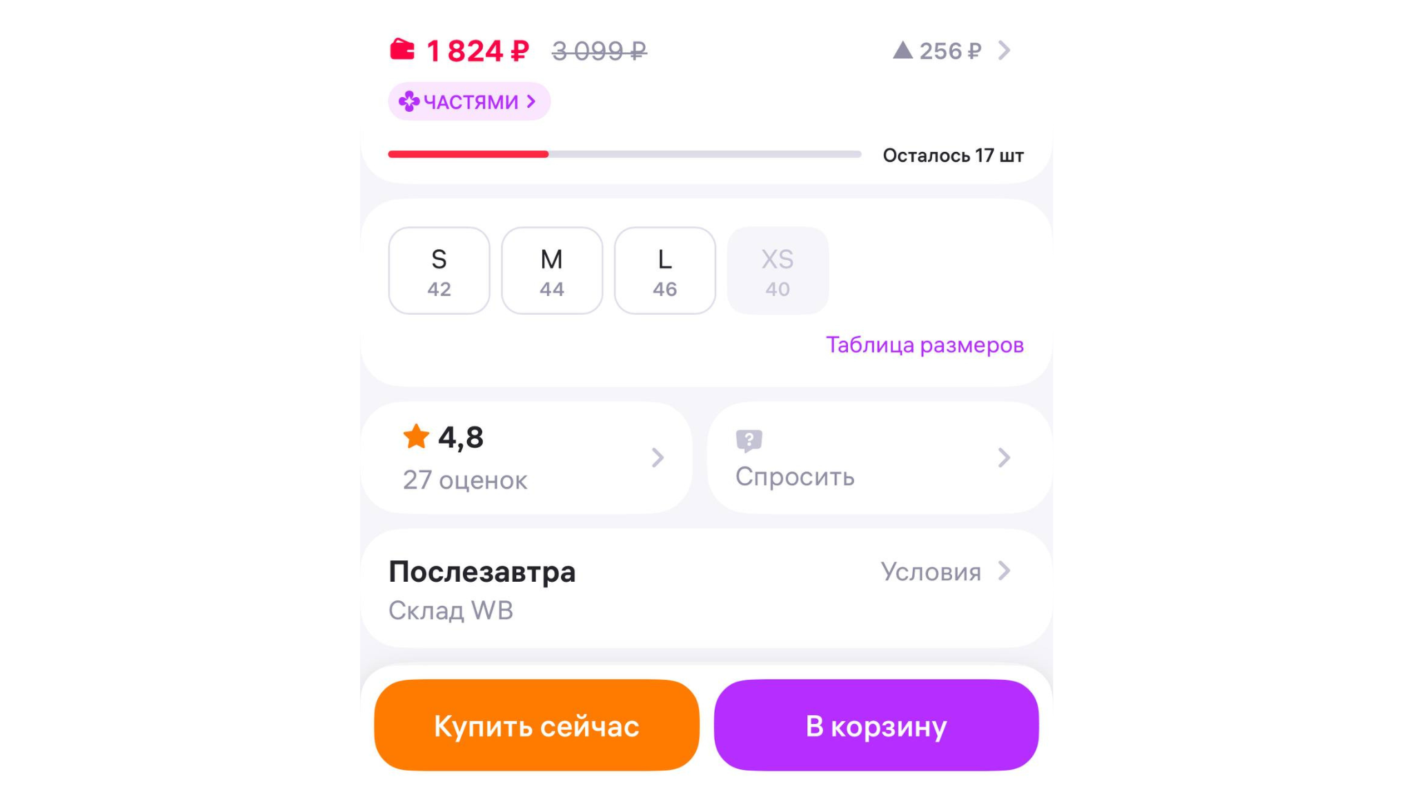 Простой и понятный заказ. Чтобы купить у вас что-то или хотя бы оставить заявку, клиенту не нужно заполнять анкету или проходить длинную цепочку действий. Чем меньше стопперов и преград в продажной воронке, тем выше будет итоговый процент конверсии. Например, на Wildberries есть кнопка «Купить сейчас» – с ее помощью можно сделать покупку в один клик. Тут конверсия будет значительно выше, чем у компании, в которой для оформления нужно связаться с менеджером, дождаться ответа, уточнить детали и так далее.