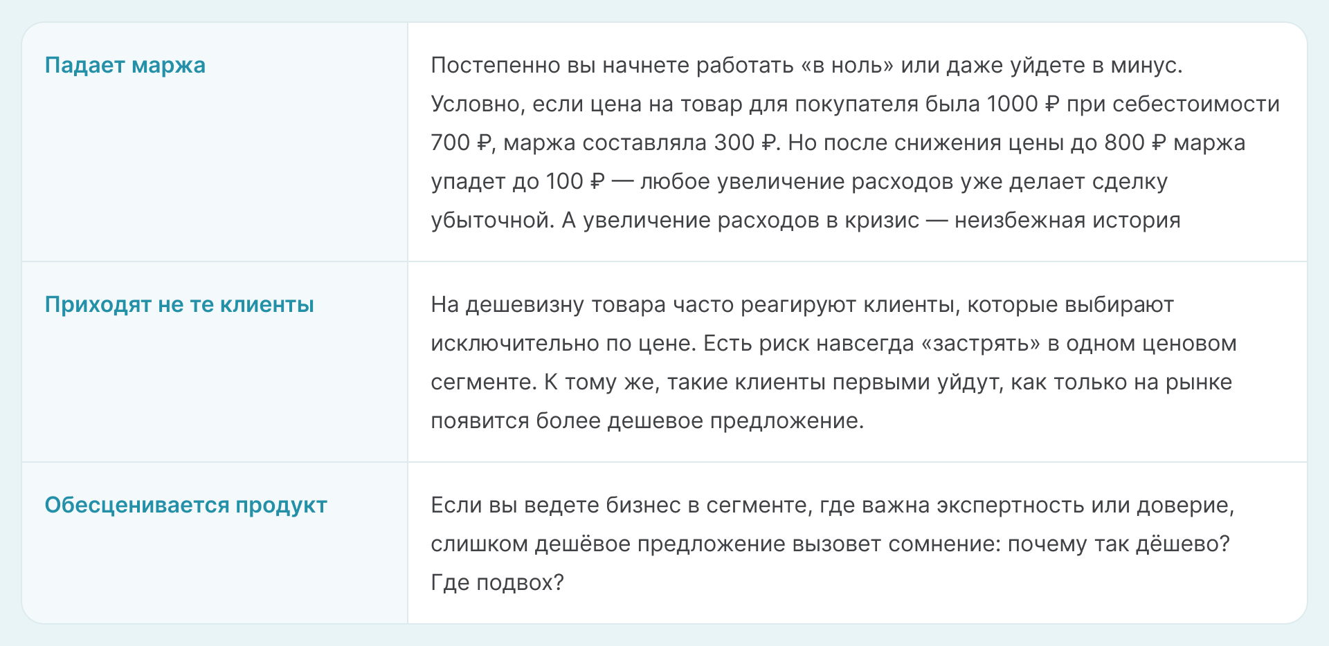Но даже так цена — не универсальный способ влиять на удержание или привлечение новых клиентов. Снижение цены может дать краткосрочный эффект. А вот долгосрочной перспективе это скорее рискованно: