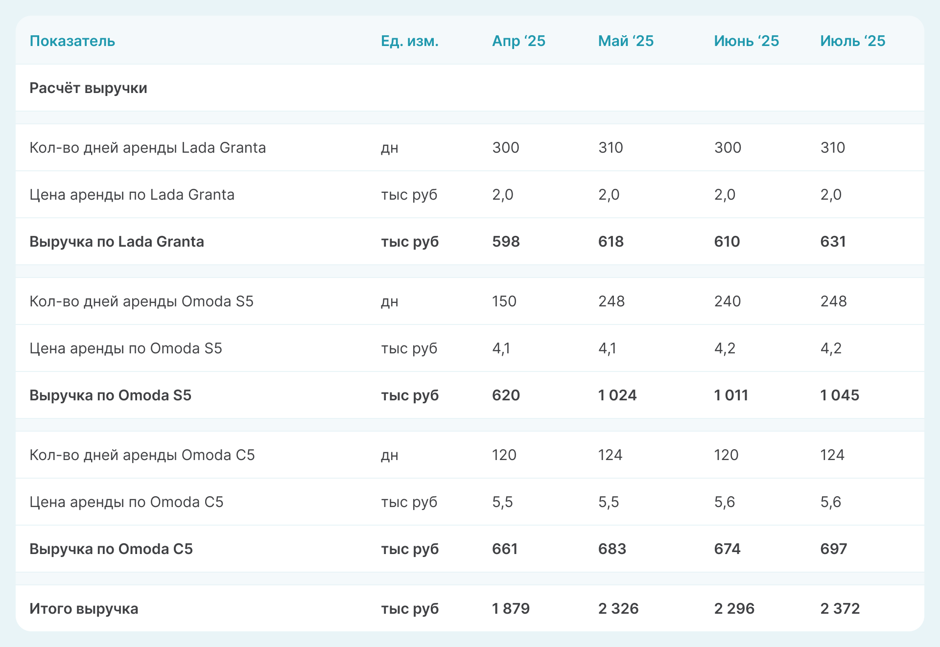 1. Выручка. Формируется исходя из количества арендованных часов и стоимости аренды за час. Планируется закупать 3 вида автомобилей. Для каждого вида отдельно указали цену и подсчитали выручку. Прогнозируемый объем оказываемых услуг рассчитали исходя из воронки продаж, при планировании учли сезонность. Ввели в модель показатель максимальной загруженности в днях.