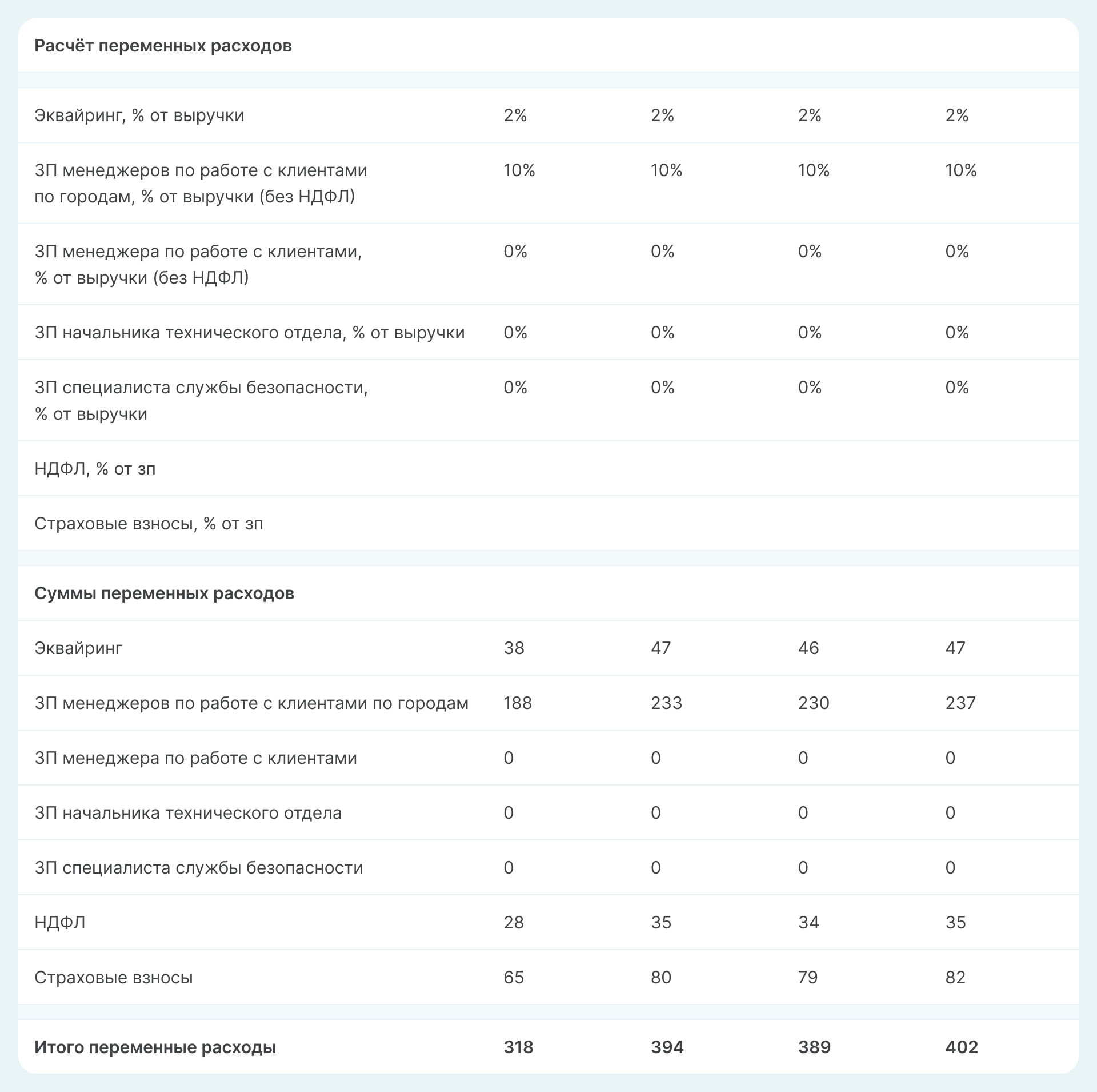 2. Переменные расходы. Рассчитали зарплаты сотрудников с условно-переменной частью, НДФЛ, страховые взносы, эквайринговые платежи. Учли заложенные доли от выручки.