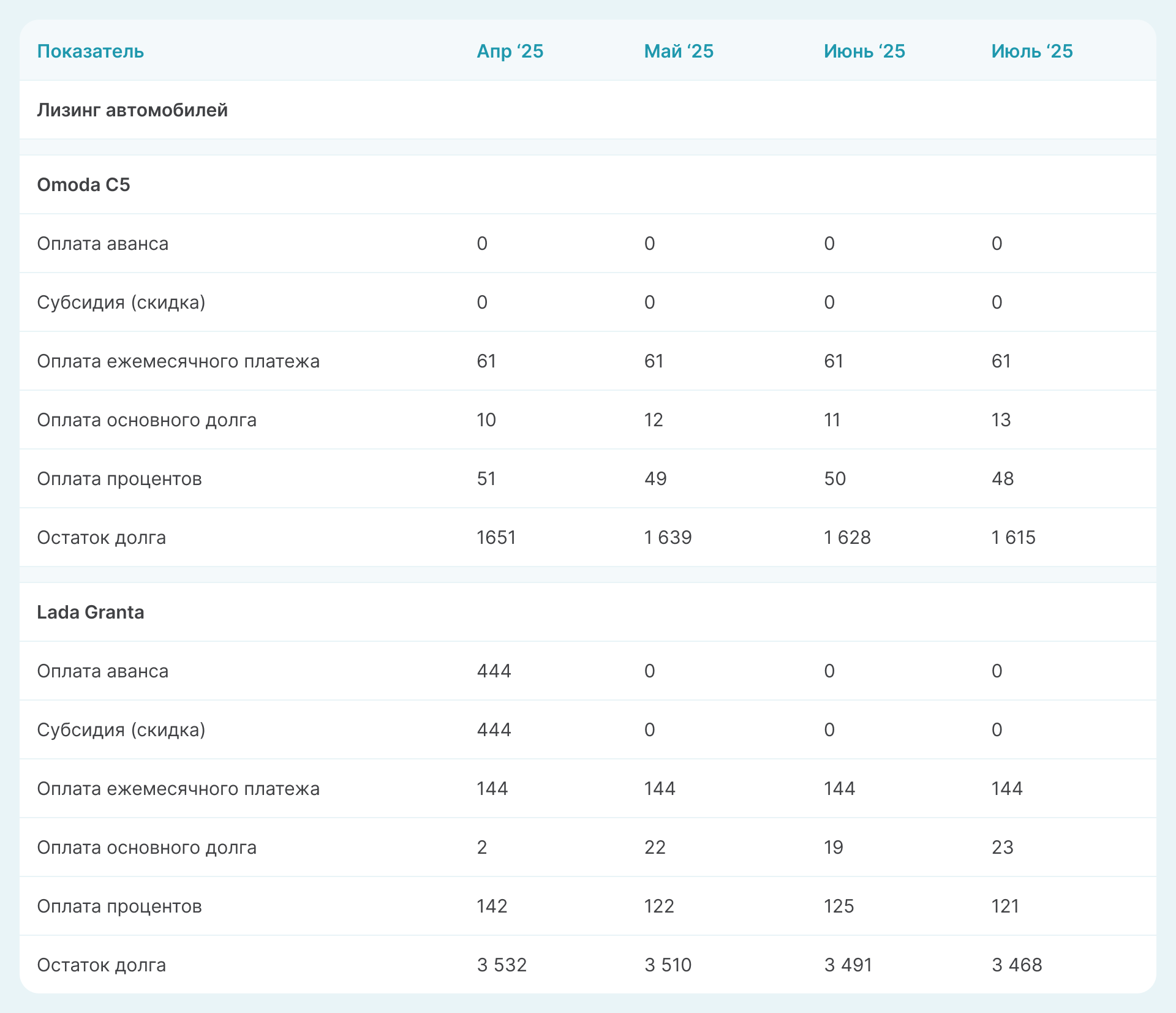 4. Лизинговые платежи, кредиты и займы. До мая 2025 года компания планирует закупить 22 автомобиля: 14 в лизинг, 8 за собственные деньги. Бизнес хочет привлечь займ от инвестора в размере 5 млн рублей под 40 % годовых с выплатой процентов в течении года и возврата основного долга через год. Также собственник планирует вложить 7 млн рублей собственных средств.