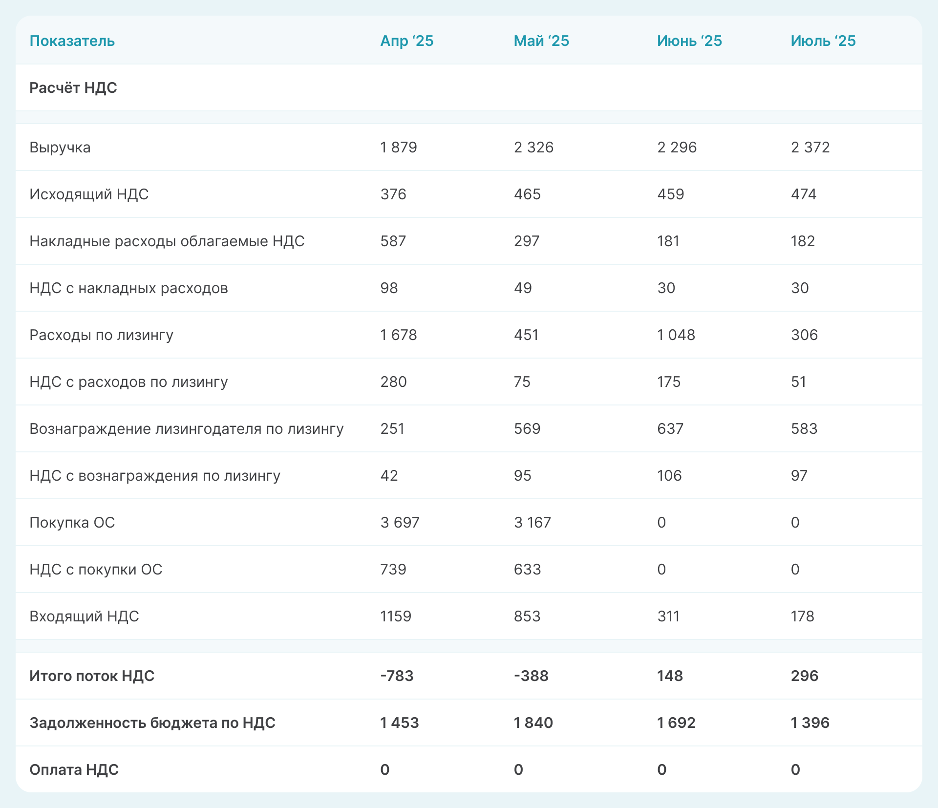 6. Расчет НДС. Покупка автомобилей за свой счет и лизинговые платежи создают значительный входной НДС, который покрывает НДС с выручки. От этого образуется дебиторская задолженность из бюджета. Таким образом оплачивать налог нужно будет только с декабря 2025 года.