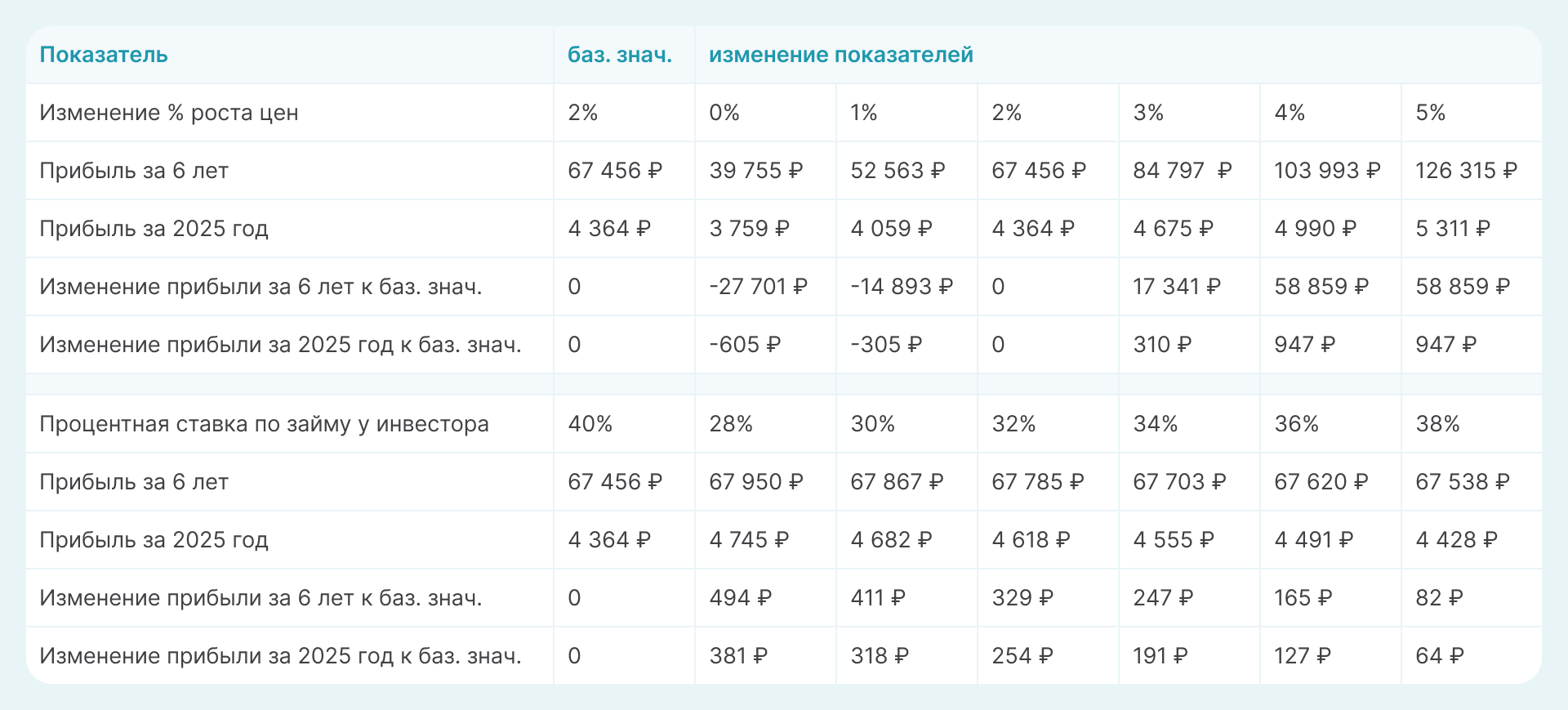 Посмотрели, как повлияет изменение процентной ставки по займу у инвестора: при ее уменьшении на 10%, прибыль увеличится на 318 тыс рублей в 2025 году и на 411 тыс. рублей за 6 лет.