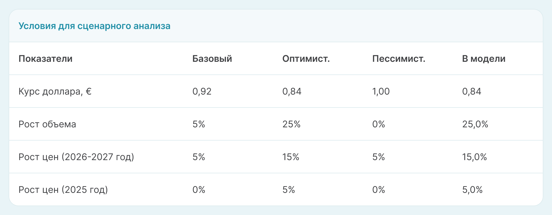 - При росте цены даже на 5%, компания в 2025 году выйдет на положительный результат по прибыли и увеличит ее на 75 000 евро.
