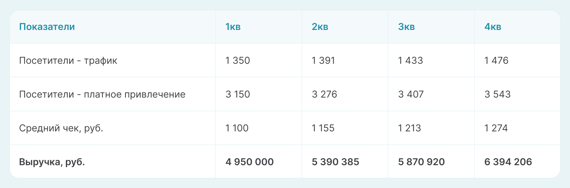 - Средний чек в 1 квартале — 1100 рублей. Далее прирост на 5% ежеквартально.