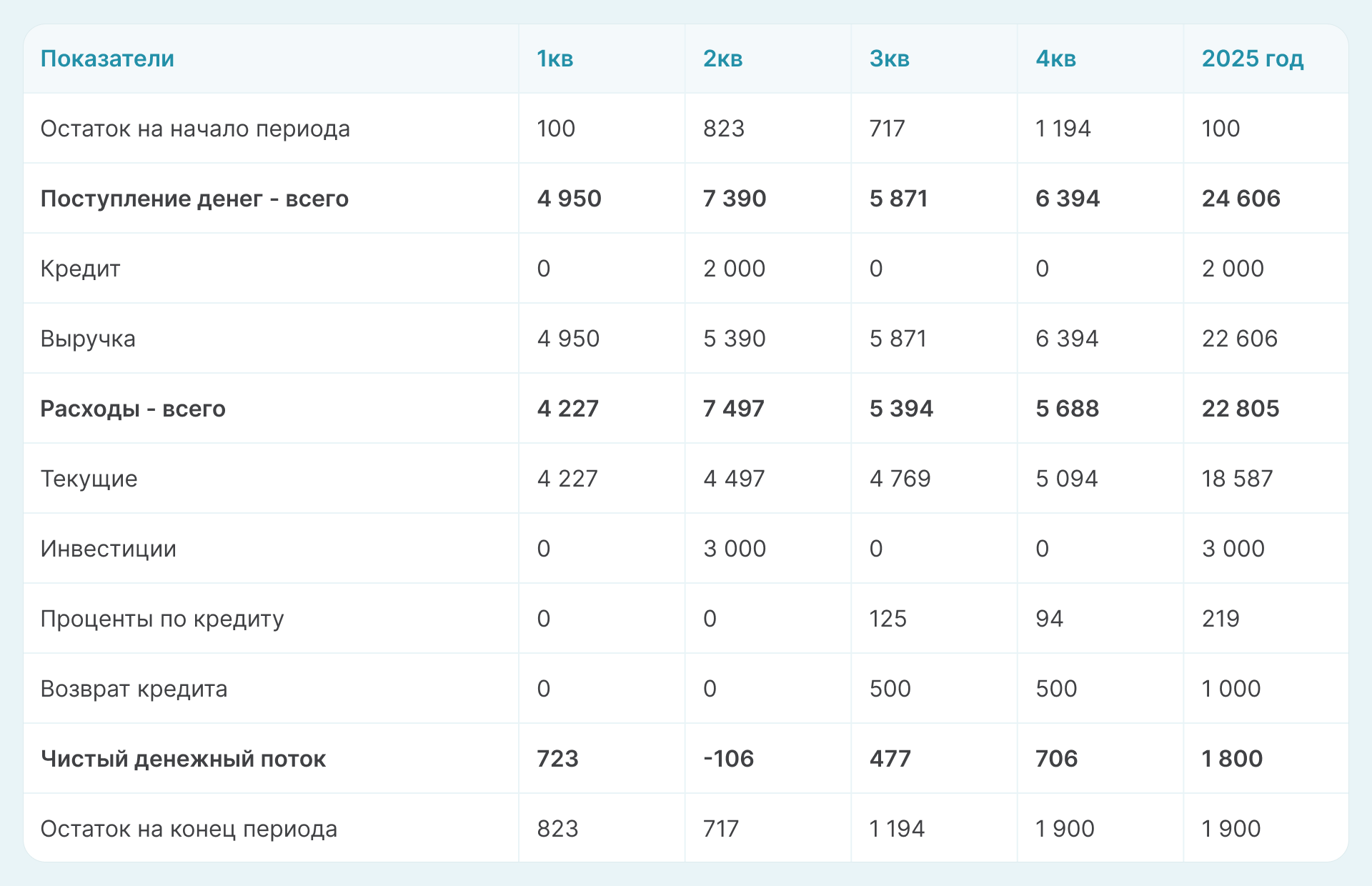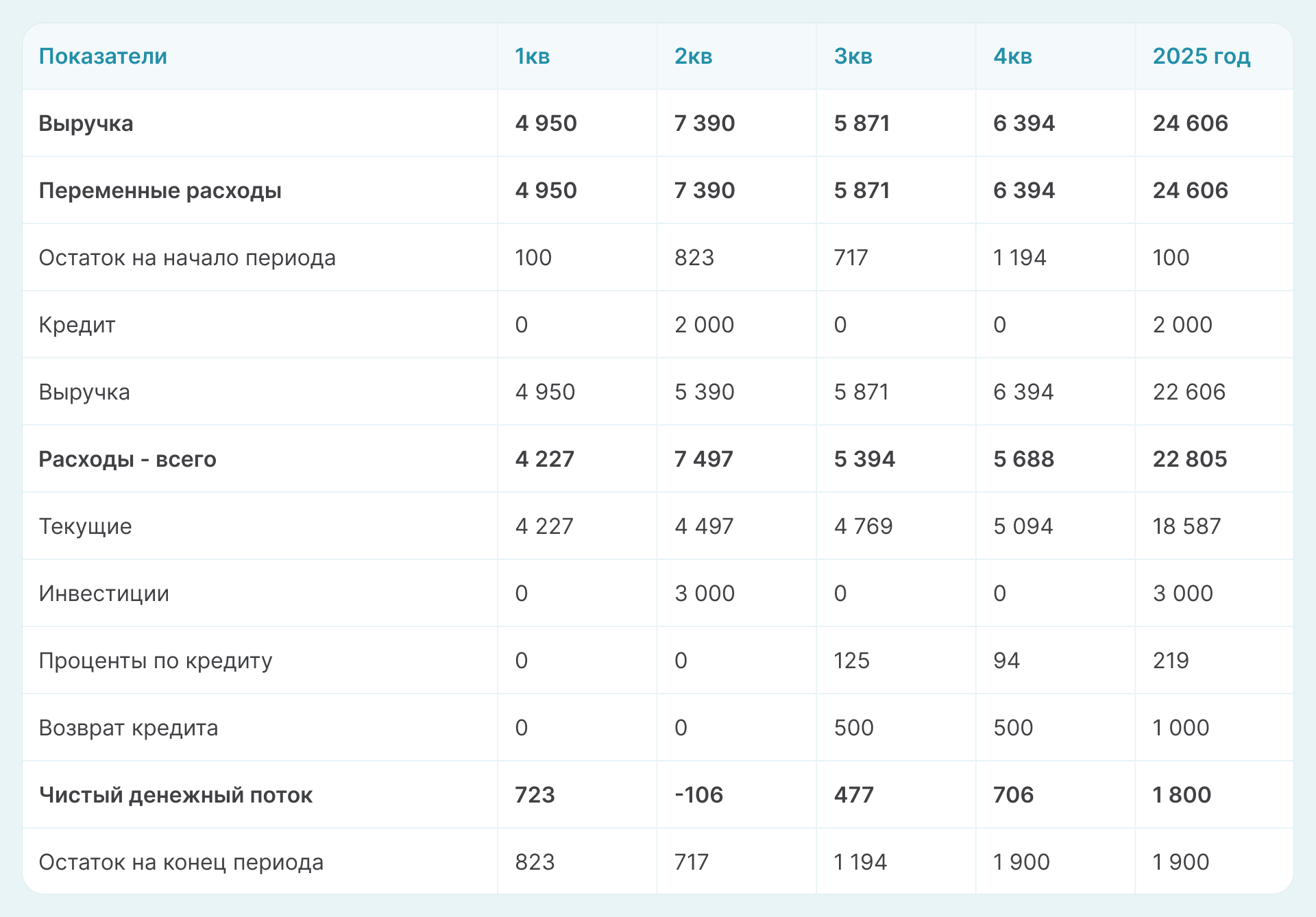 Во втором квартале запланировано приобретение нового оборудования на сумму 3 млн рублей. Часть затрат будет покрыта за счет кредита на 2 млн руб. под 25% годовых. Возврат кредита — по 500 000 рублей. ежеквартально, начиная с 3 квартала 2025 года.