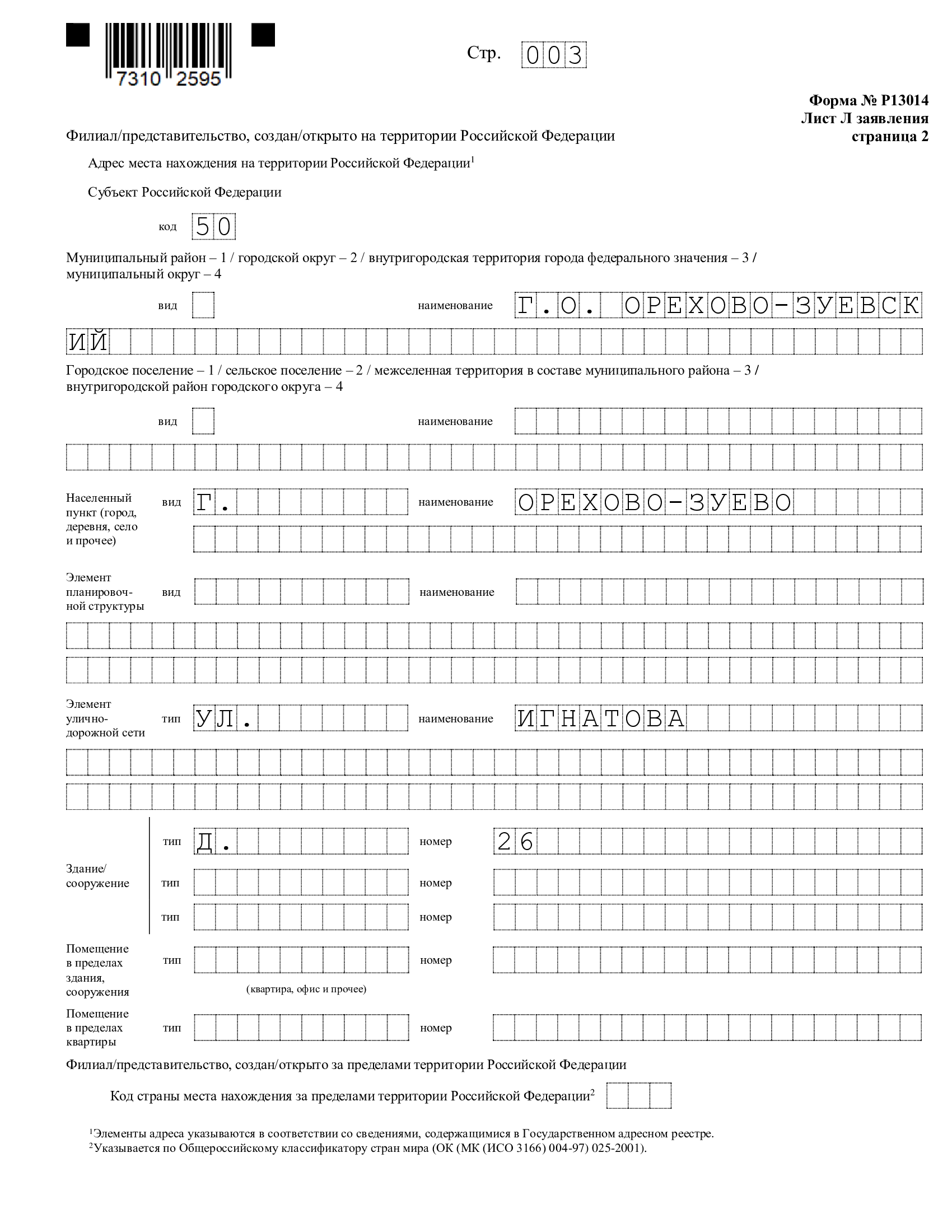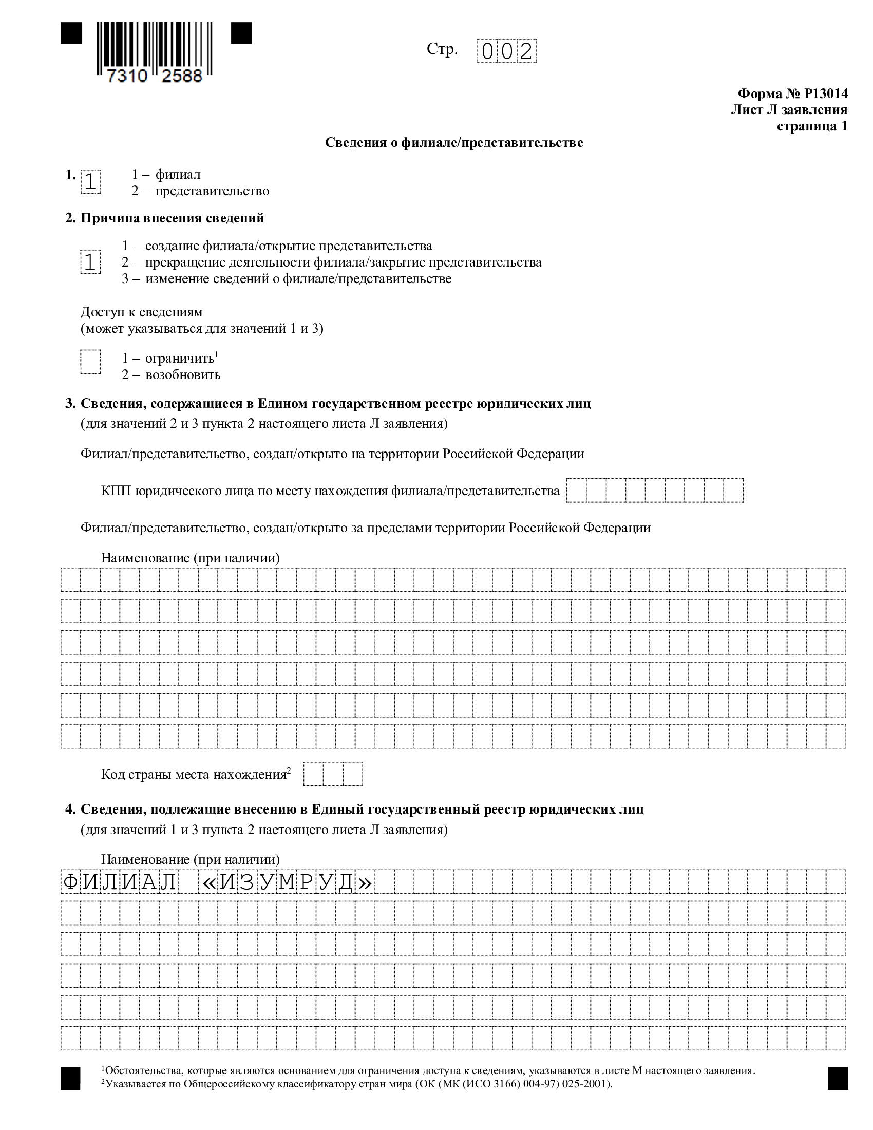 Чтобы подать заявление о регистрации филиала, нужно заполнить титульный лист, листы «Л» и «П» в форме Р13014.