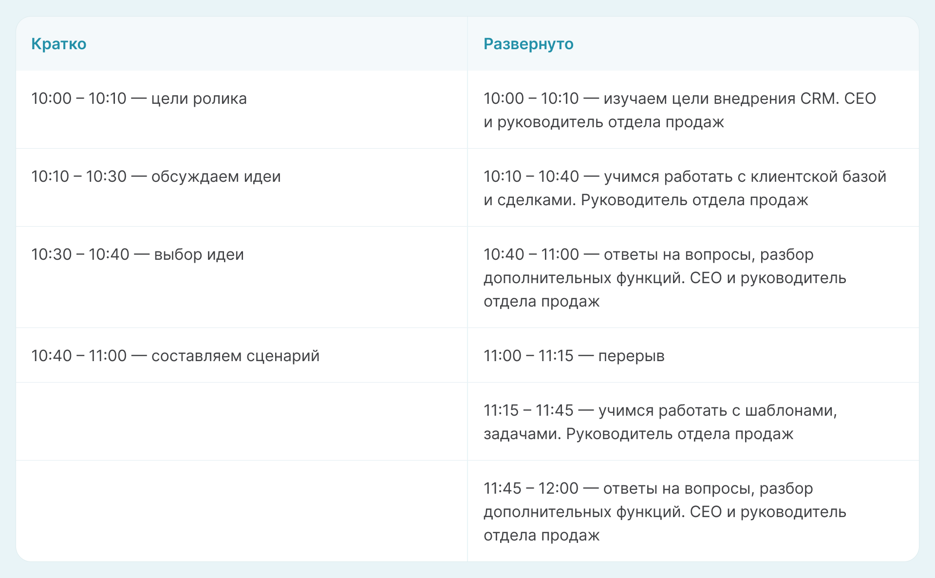 Чтобы сотрудники понимали, как готовиться к совещанию и что на нем будет, стоит составить план встречи с таймингом. План планерки пишут в развернутом виде или кратко, это зависит от особенностей совещания. Если во время встречи ограничен тайминг и команда рассматривает сложные вопросы, стоит описать план более развернуто.