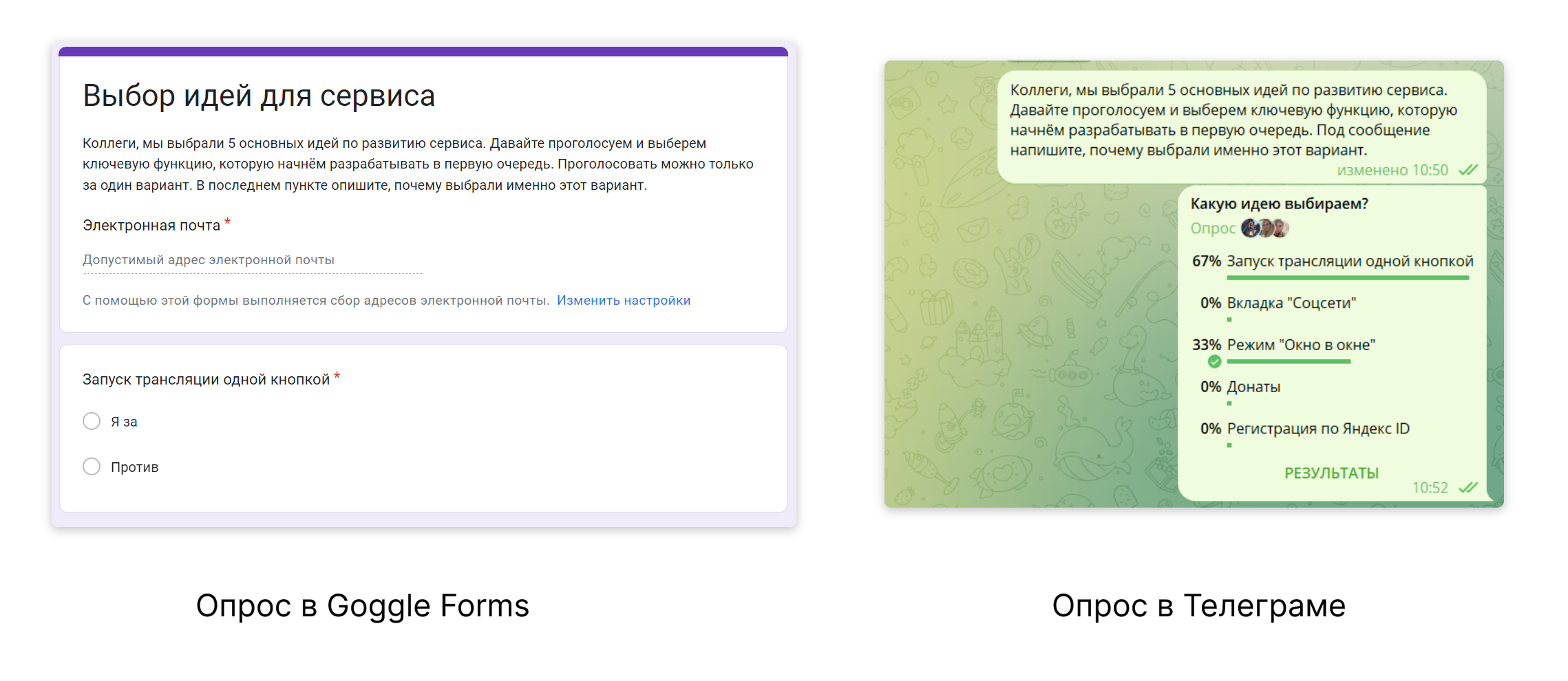 Если нужно проголосовать за понравившийся прототип сайта или выбрать лучшие варианты стратегий, можно проводить голосования и опросы.