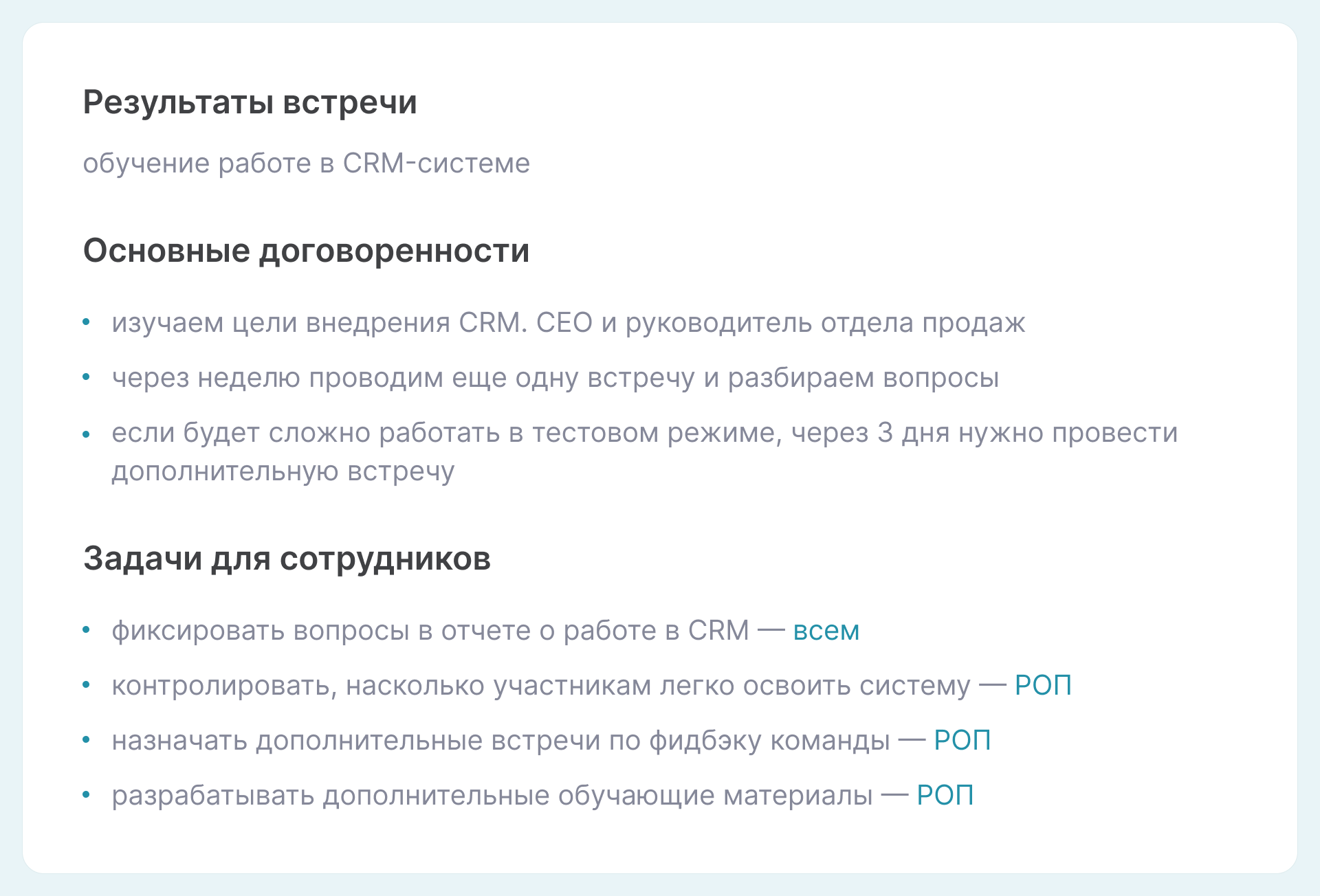 Также он рассказывает об итогах совещания людям, которые на нем не присутствовали, но должны быть в курсе. К примеру, он отправляет запись обучения в CRM-системе со встречи другим отделам, чтобы они познакомились с функциями сервиса. Затем помогает им разобраться, если возникли сложности.
