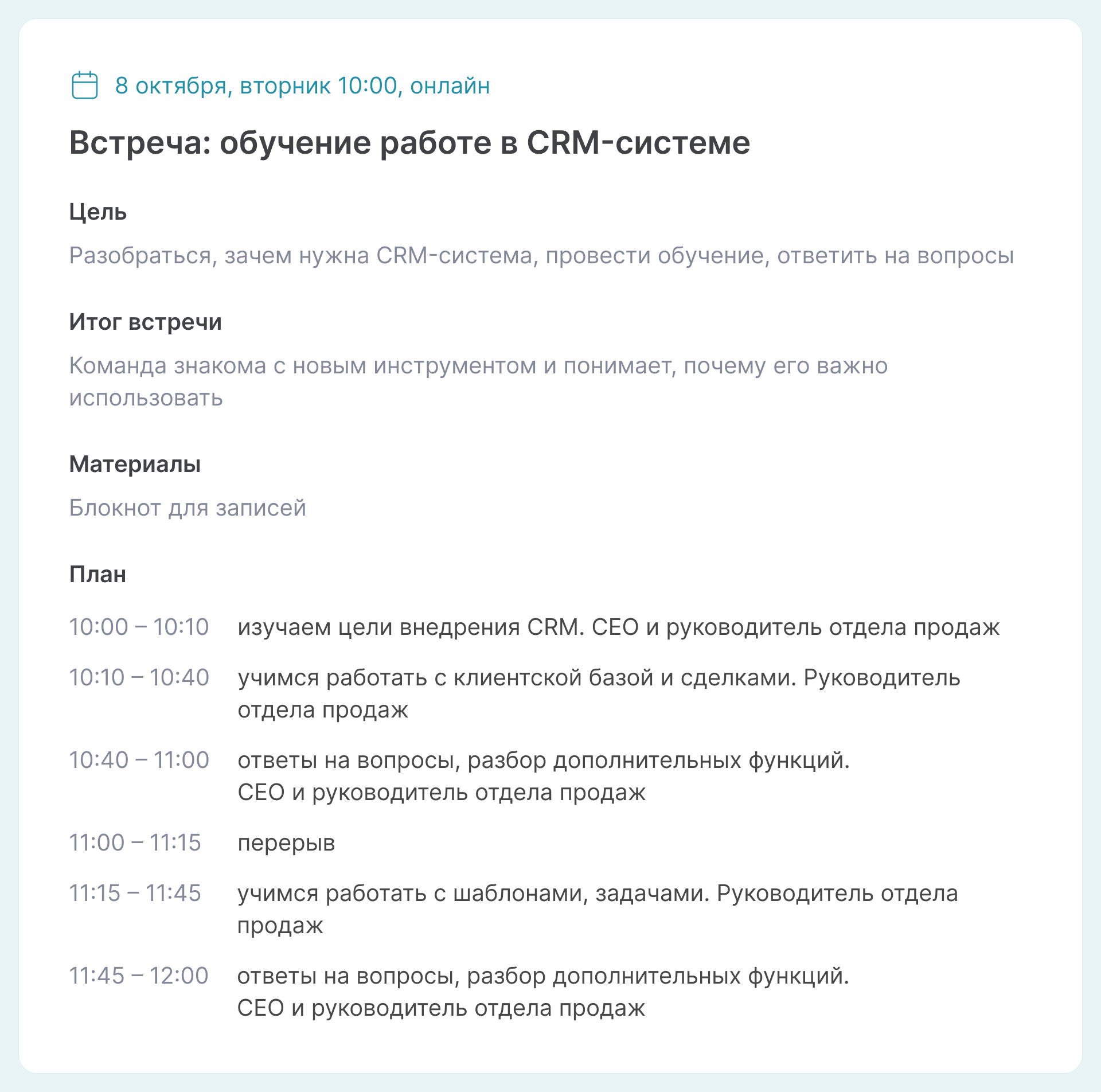- Рассказать сотрудникам, зачем нужна CRM-система, провести обучение, ответить на вопросы. Итог встречи: сотрудники знакомы с новым инструментом и понимают, почему его важно использовать.