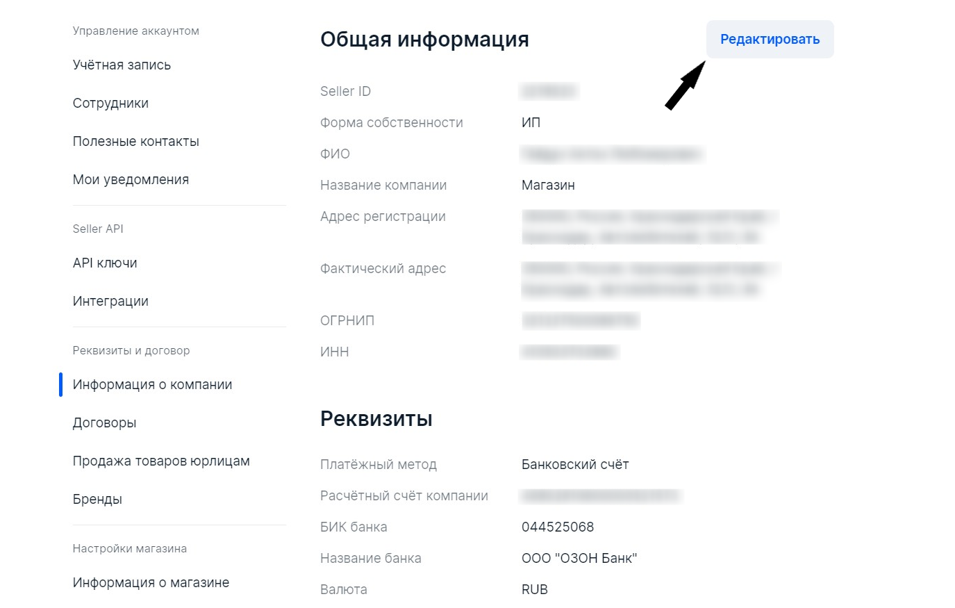 10. Ozon автоматически откроет счет в своем банке. Чтобы поменять банковские реквизиты, необходимо перейти во вкладку «Информация о компании» в «Настройках» и нажать кнопку «Редактировать».