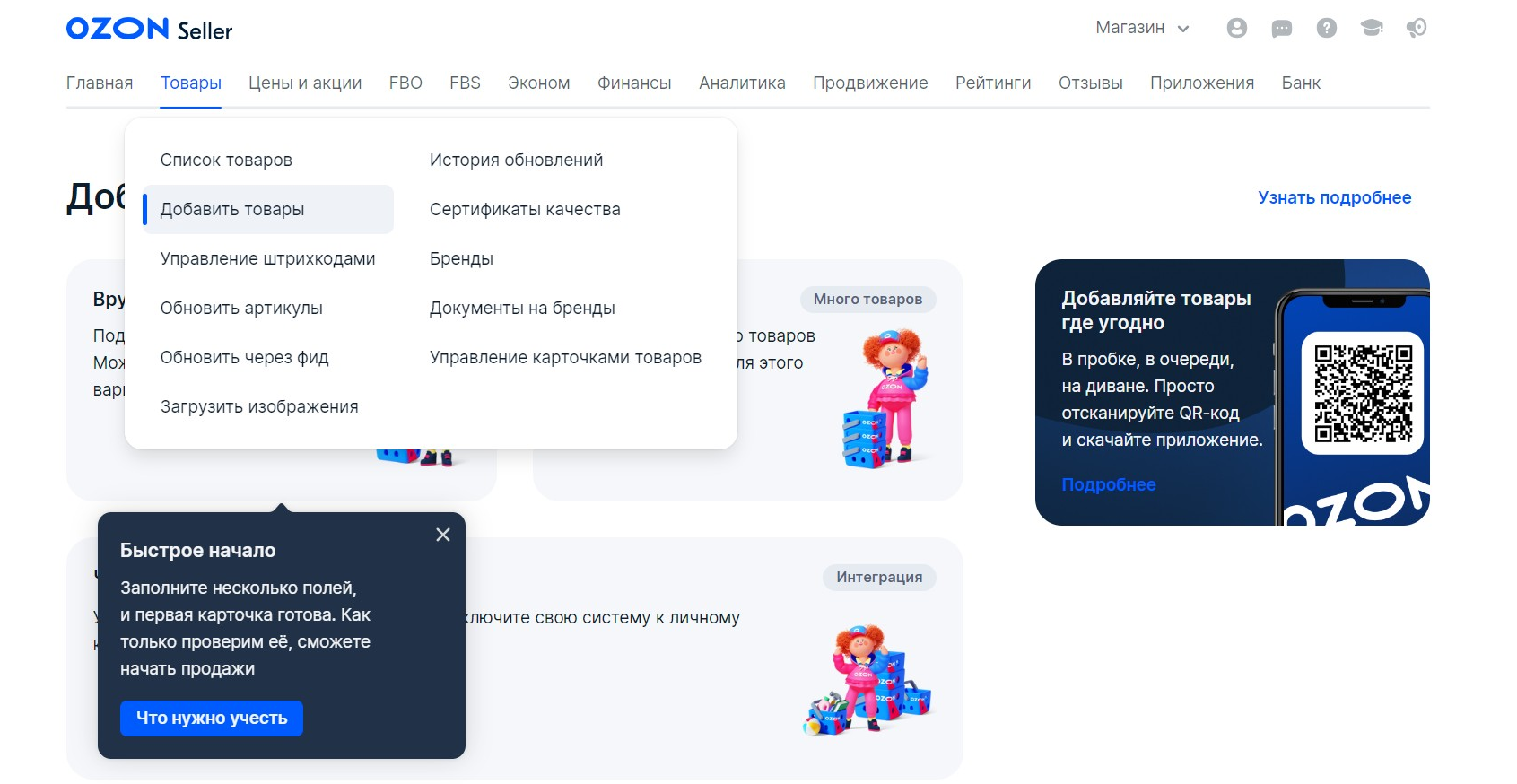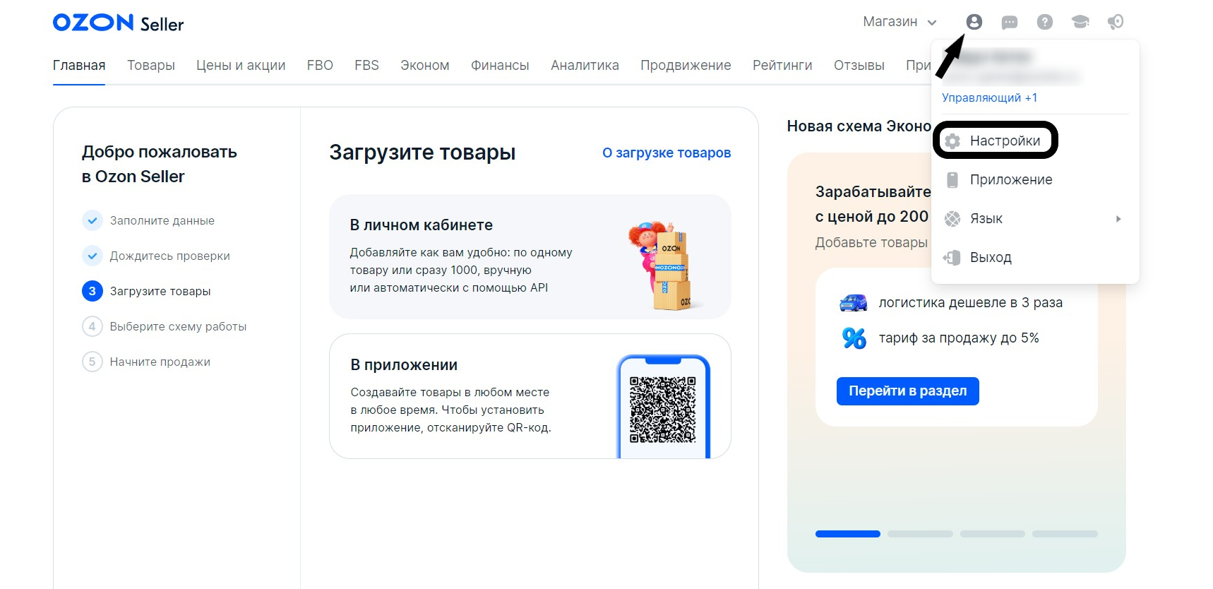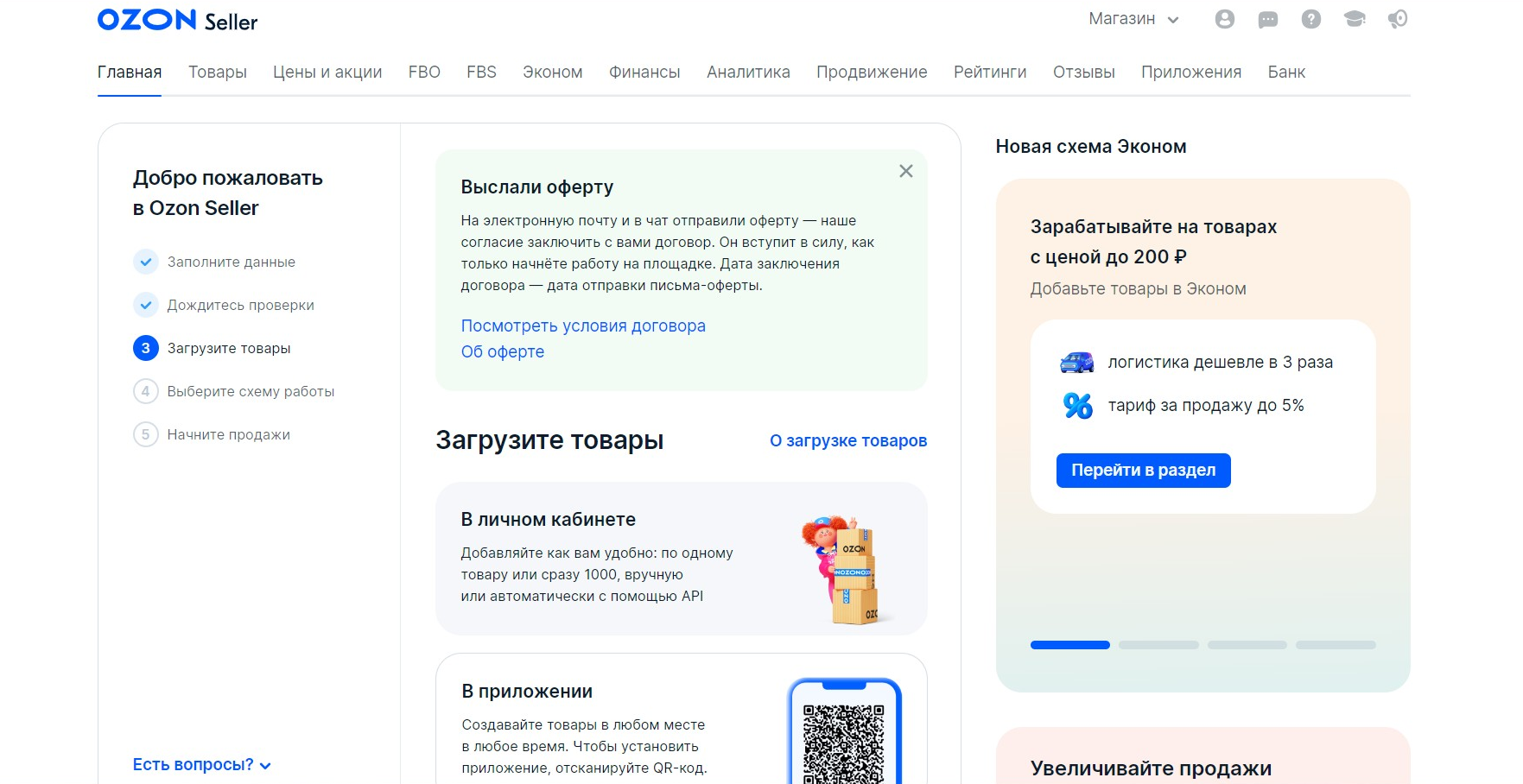 Чтобы начать продавать на Ozon, нужно загрузить товары в личном кабинете сервиса и выбрать схему работы: FBO, FBS, realFBS.
