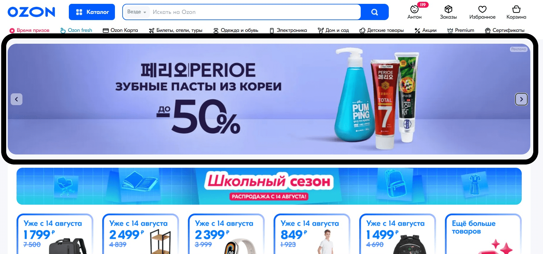 Пример баннера с рекламой зубных паст на главной странице Ozon