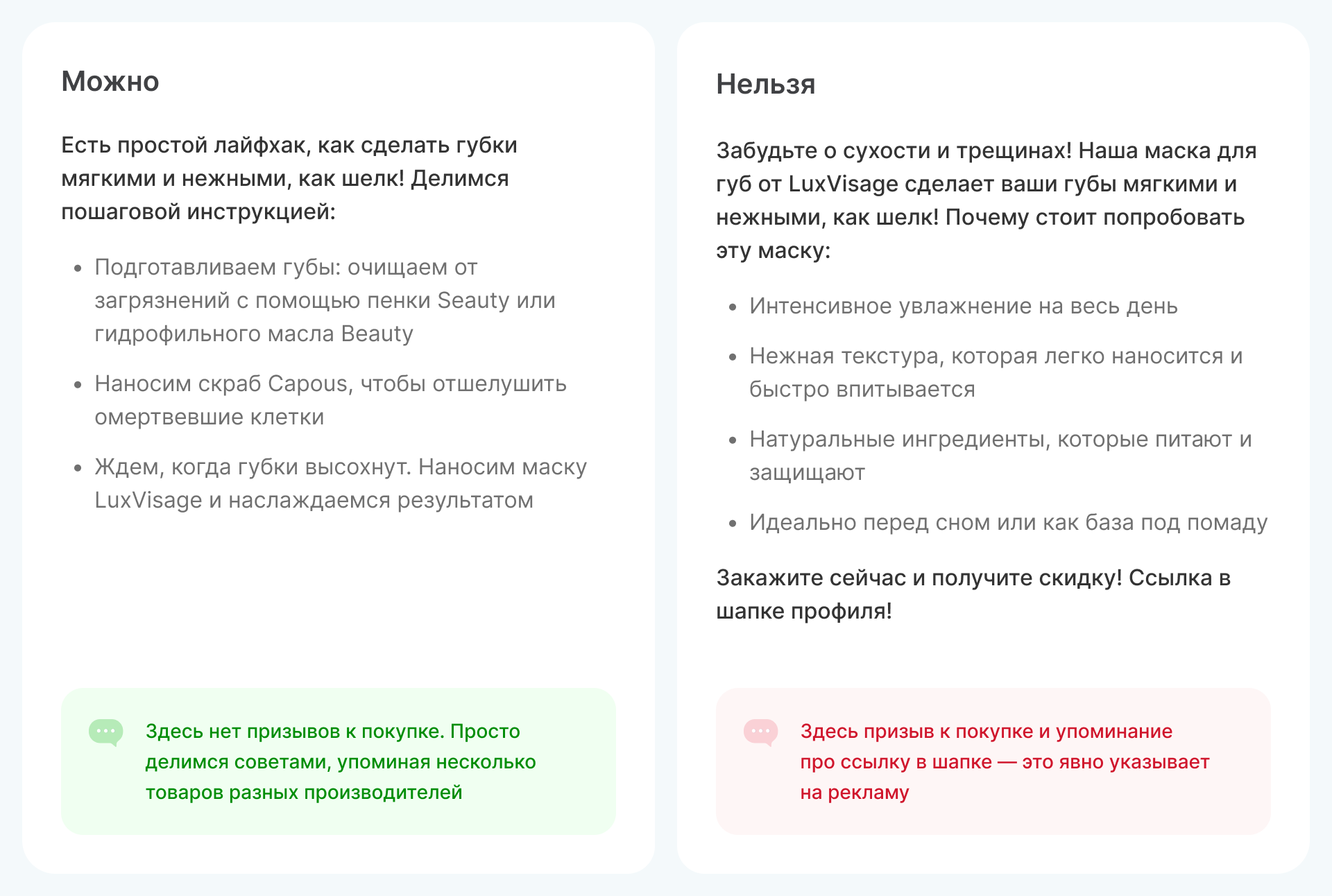 Можно говорить о своих продуктах вскользь и без призывов к покупке, главное — соблюдать осторожность. Не стоит говорить о чьих-то товарах, делать отметки. Лучше не добавлять в закрепы посты с описанием услуг. Некоторые юристы считают, что в ФАС это могут квалифицировать как саморекламу.