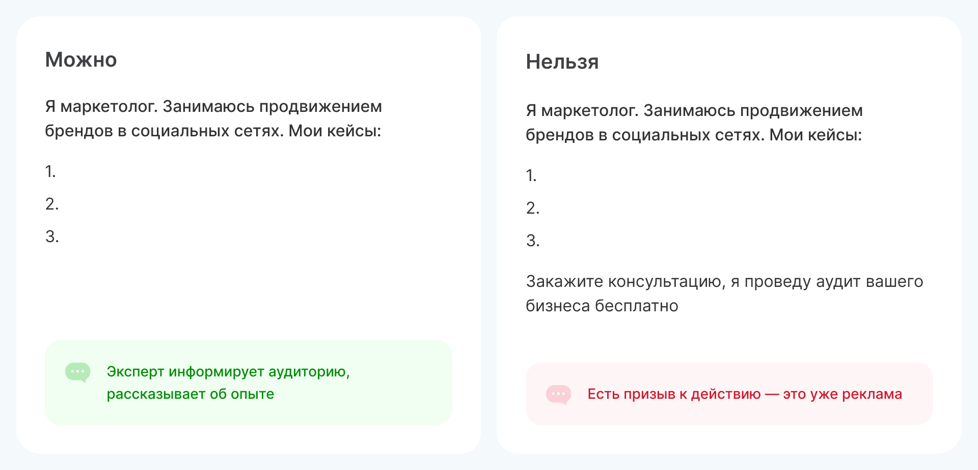 Вести аккаунт, информировать людей о сфере деятельности — можно, рекламировать себя — нет. Грань очень тонкая, попробуем показать еще на одном примере ↓