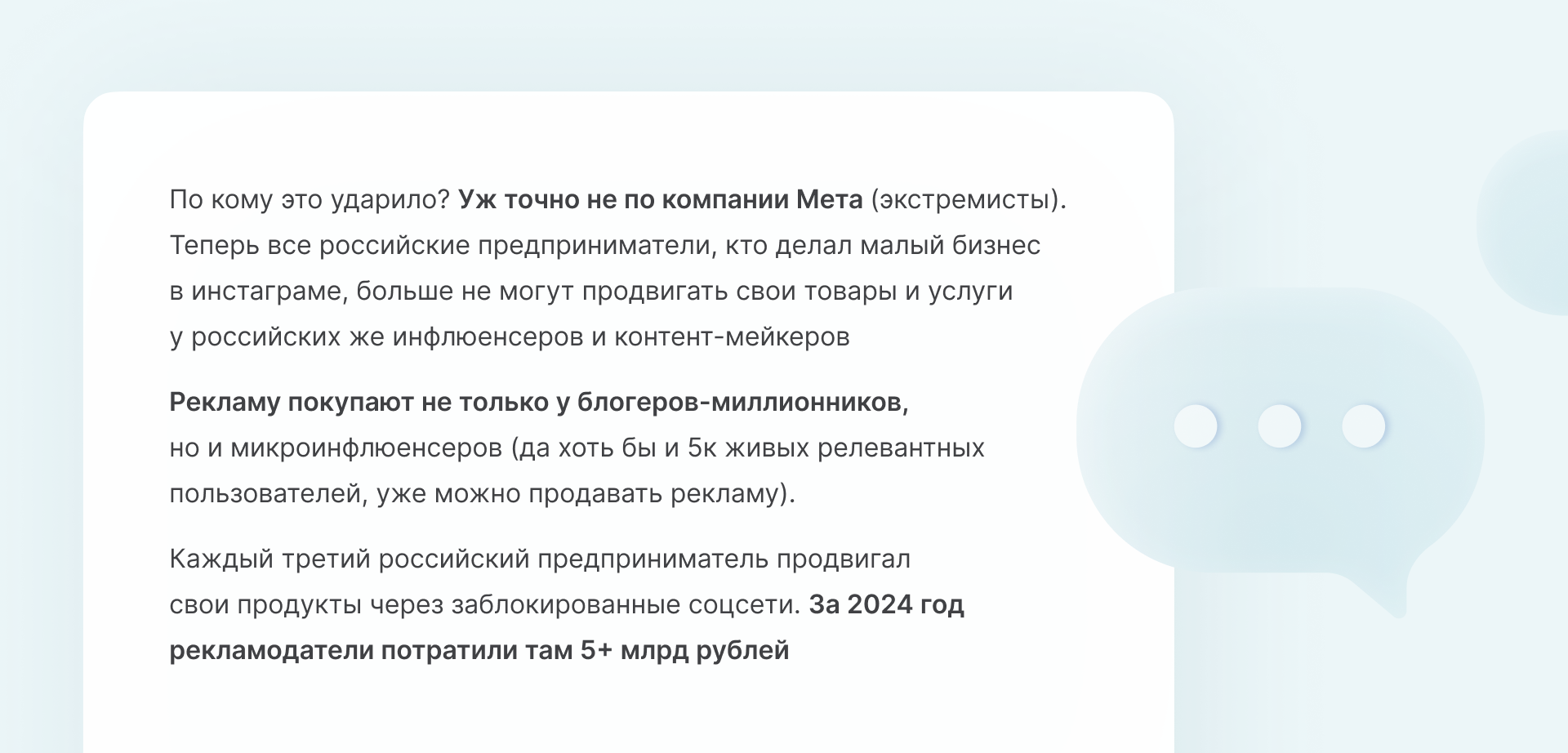 Хорошая новость: можно продолжать вести аккаунт компании в запрещенных соцсетях, но не призывать пользователей к покупке. А вот заказывать рекламу у блогеров с 1 сентября 2025 года будет запрещено.