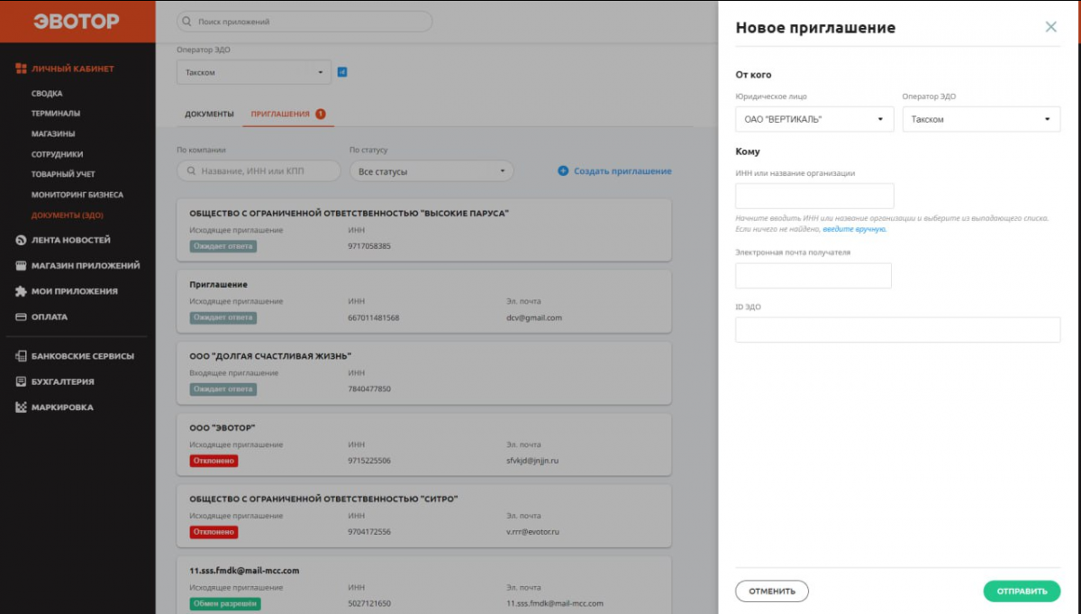 Так выглядит приглашение контрагентов в системе Эвотора. Источник: zhiza.evotor.ru