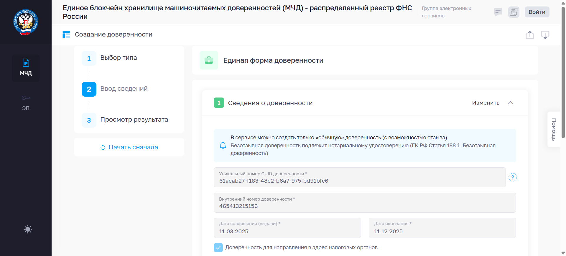 Как создать МЧД. Перейдите на сайт налоговой. Здесь нужно выбрать тип доверенности, указать данные: внутренний номер доверенности, срок действия, ФИО, ИНН, СНИЛС доверителя, данные о представителях, их полномочиях.