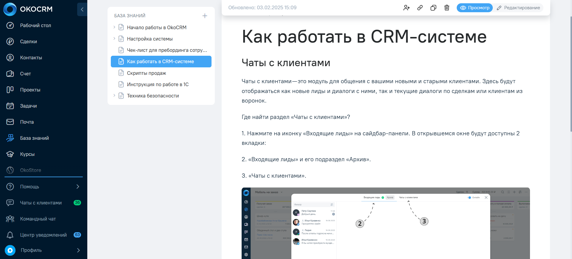 Такая база знаний помогает обучить удаленных сотрудников. Источник: OkoCRM
