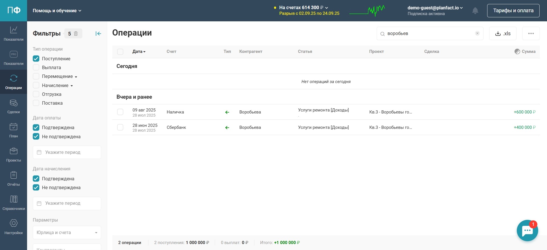 Отслеживать ключевых клиентов можно в сервисе Планфакт. Здесь в разделе «Операции» легко проанализировать все источники доходов. Это поможет увидеть, кто из клиентов приносит больше денег и понять, от кого зависит компания.