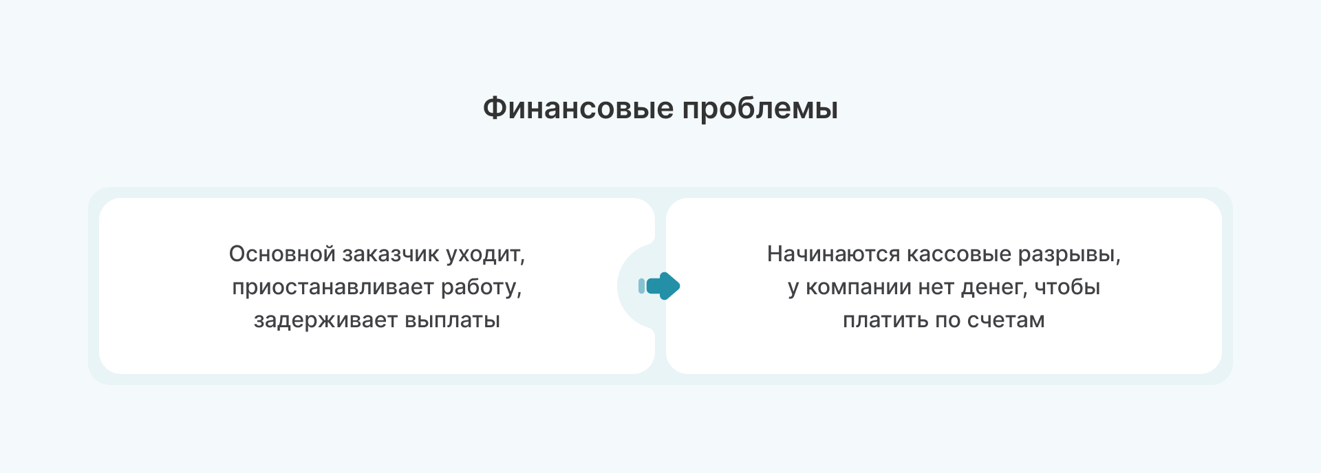 Даже если заказчики не полностью прекратят сотрудничество, а начнут задерживать оплату, это грозит кассовыми разрывами. Компании может быть сложно платить зарплаты или аренду, придется придумывать, где брать деньги или экстренно искать новые заказы.