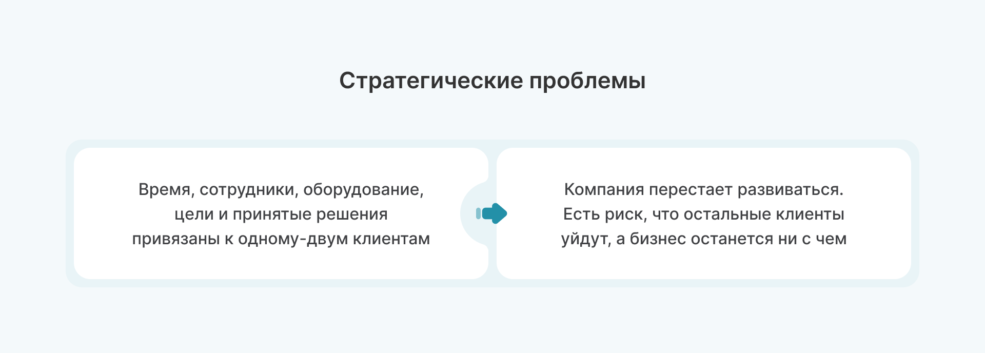 Когда все ресурсы — время, сотрудники, оборудование, цели, принятые решения — привязаны к одному-двум клиентам, бизнес теряет гибкость. Все силы уходят на удовлетворение запросов текущих заказчиков. Нет времени, чтобы создавать что-то новое. Компания не может развиваться.