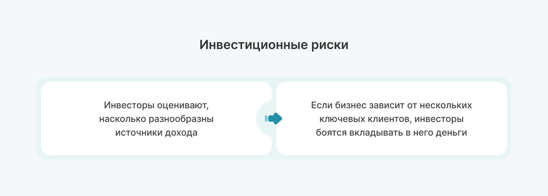 Инвесторы при оценке бизнеса анализируют все потенциальные угрозы, в том числе количество клиентов, распределение прибыли, разнообразие источников дохода. Инвесторы предпочитают не вкладывать деньги в компании, чьи доходы завязаны на нескольких ключевых покупателях.