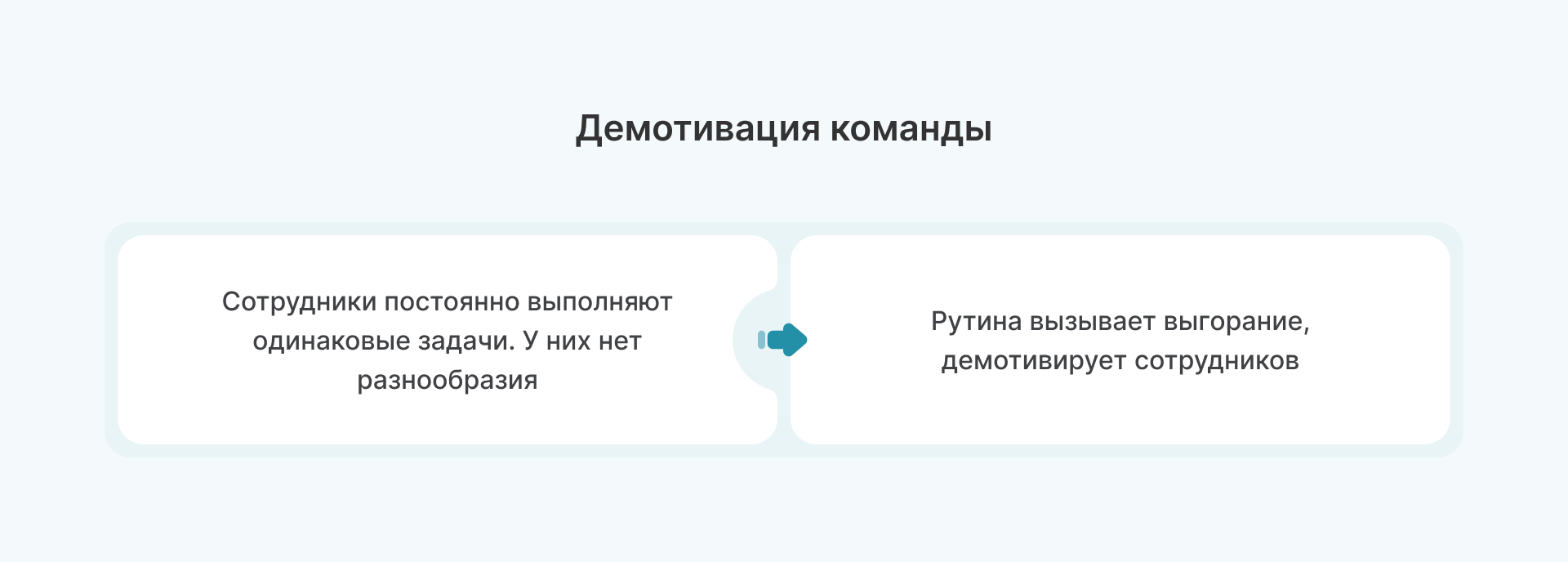 К примеру, команда маркетологов ведет рекламные кампании двух заказчиков. Работа идет по накатанной схеме: собрали креативы, протестировали, запустили, собрали фидбэк, улучшили, снова запустили. Заказчики консервативны, не дают тестировать разные форматы, подходы. Сотрудники устают от одинаковых задач. Кто-то задумывается над переходом в другую компанию, кто-то просто выгорает, работает в полсилы.