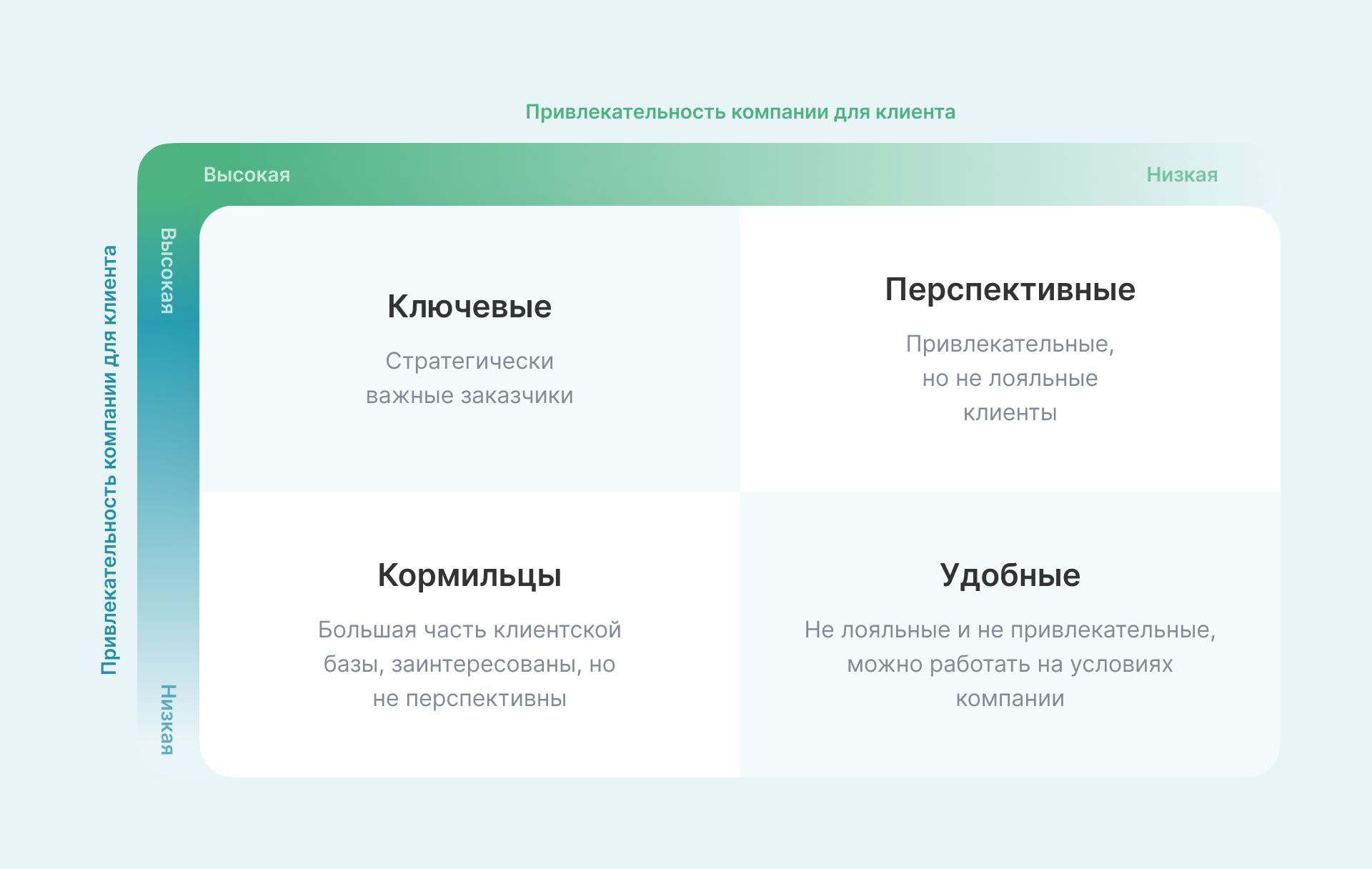 Используйте матрицу KAISM. Она позволяет разделить клиентов на четыре категории. Для визуализации данных в матрице есть две оси: