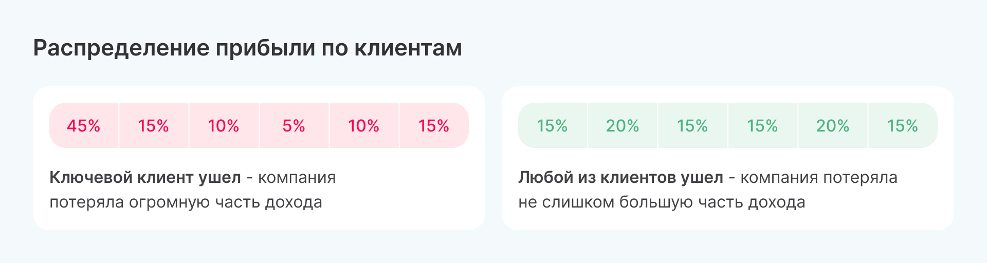 Если один из корпоративных клиентов приносит 45% прибыли, при его уходе команда теряет весомую часть дохода. Это может негативно отразиться на бизнесе: появятся кассовые разрывы, не будет хватать денег, чтобы покрыть расходы.