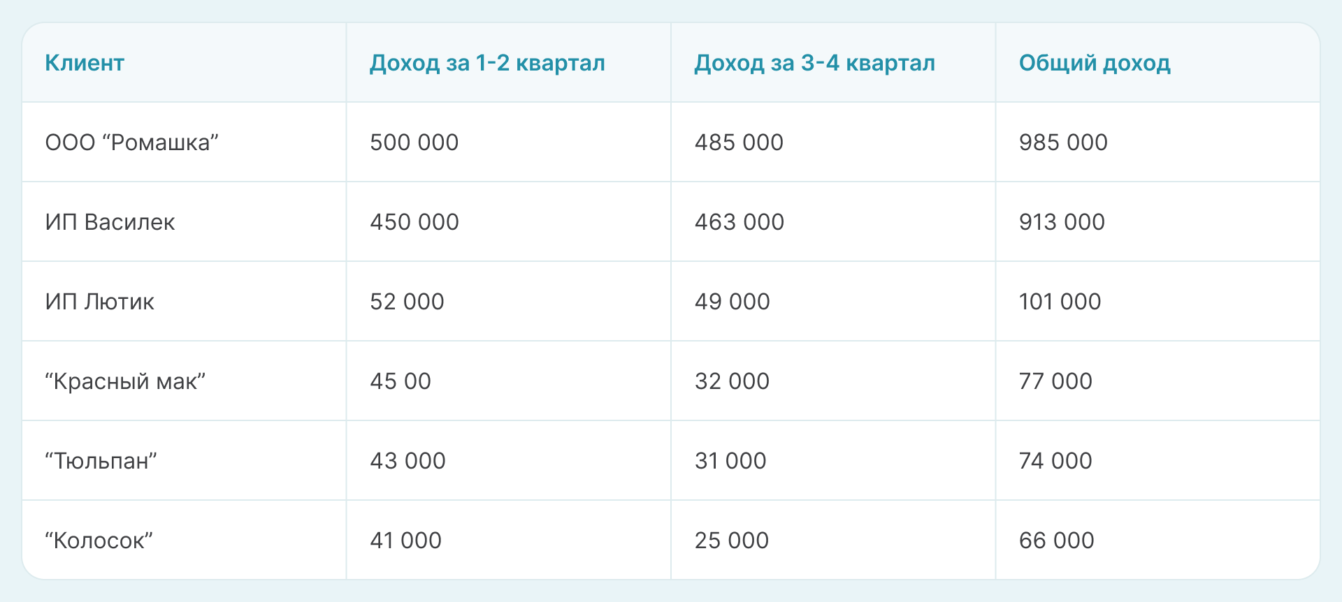 Из примера видно, что компания зависит от двух заказчиков: ООО «Ромашка», ИП Василек. От них бизнес получает большую часть выручки: