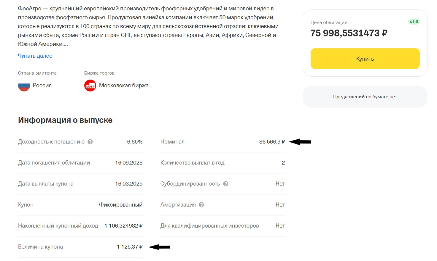 Пример замещающей облигации от компании ФосАгро, которая выпущена в долларах США. При этом номинал, величина купона и другие денежные показатели в долговой бумаге выражены в рублях.