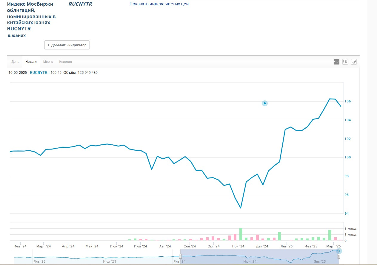 Например, , который показывает динамику по юаневым облигациям, видно, что с конца 2024 года растет спрос на долговые бумаги в китайской валюте