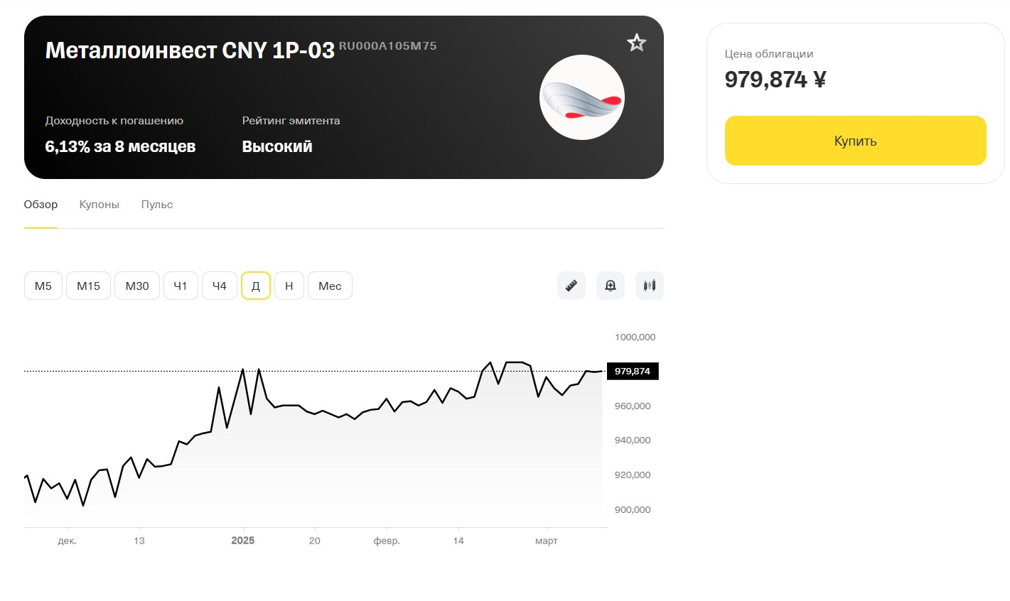 юаневой облигации, которую можно купить у брокеров. У долговой ценной бумаги Металлоинвест CNY 1P-03 номинал составляет 1000 юаней, а величина купона — 16,21 юаней