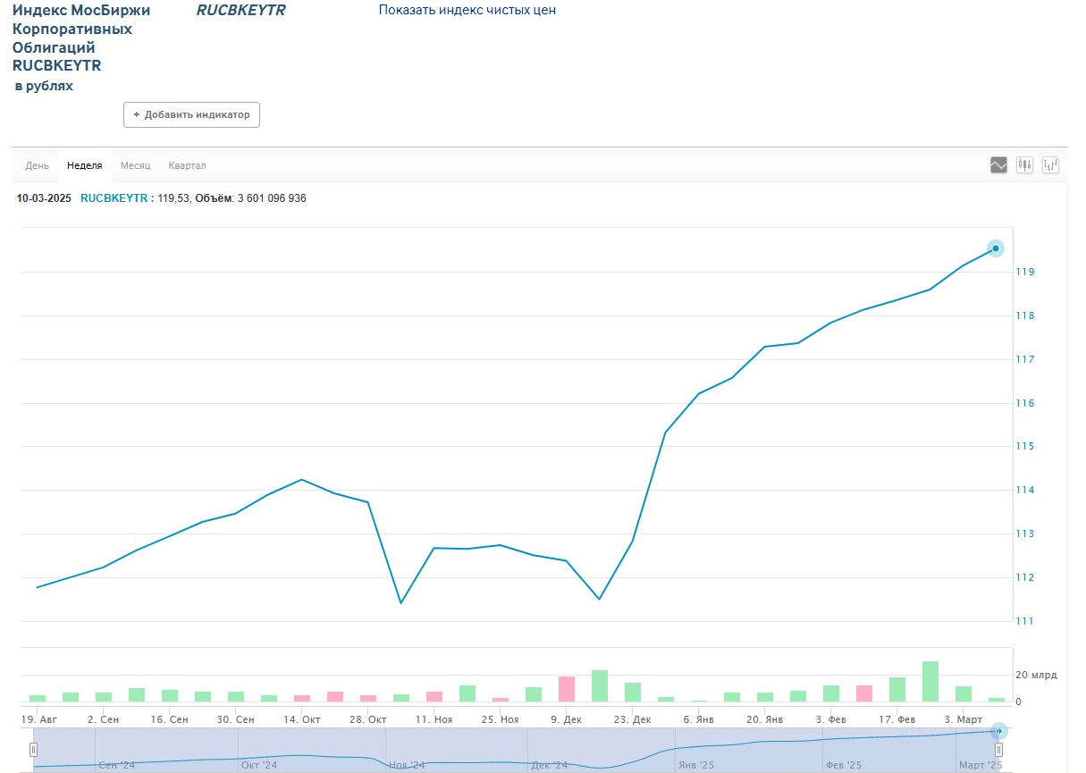 - индекс корпоративных облигаций RUCBTRNS — демонстрирует, как меняется рынок корпоративных долговых бумаг.