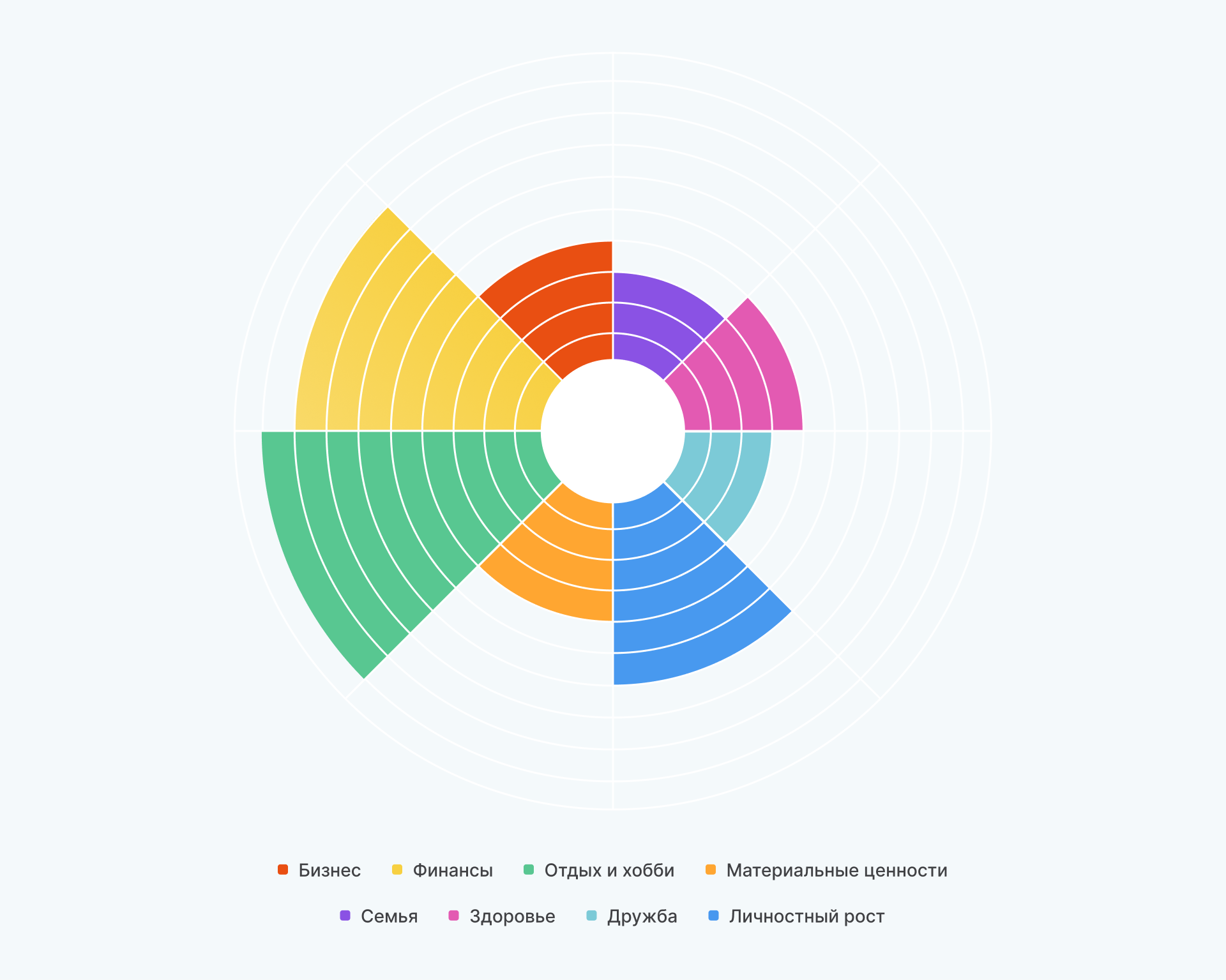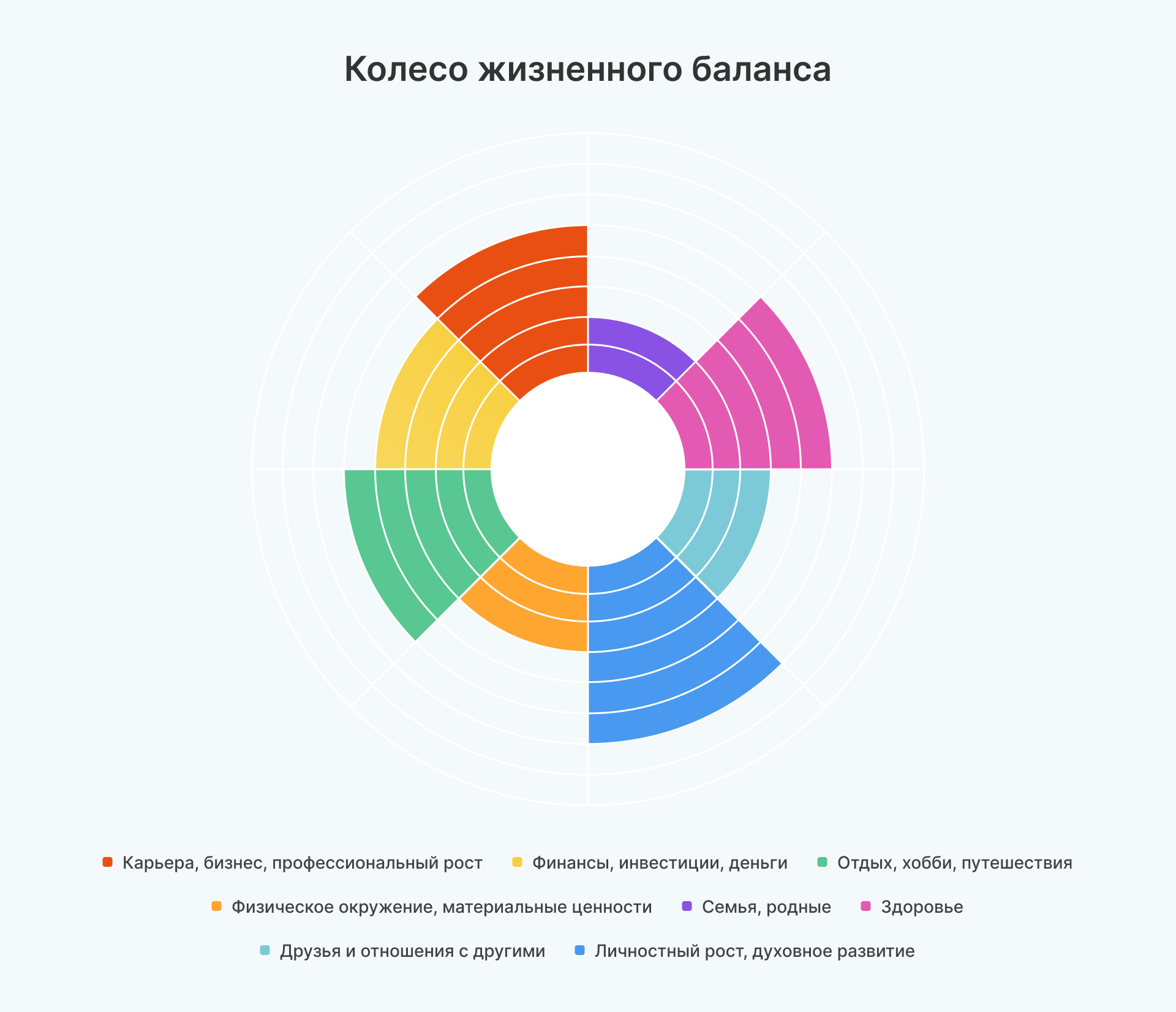 Задача колеса баланса — помочь визуализировать все сферы жизни, увидеть, где есть «провалы», и наметить направления, которые требуют внимания. По сути, это зеркало, которое показывает, как распределяются силы и ресурсы человека.