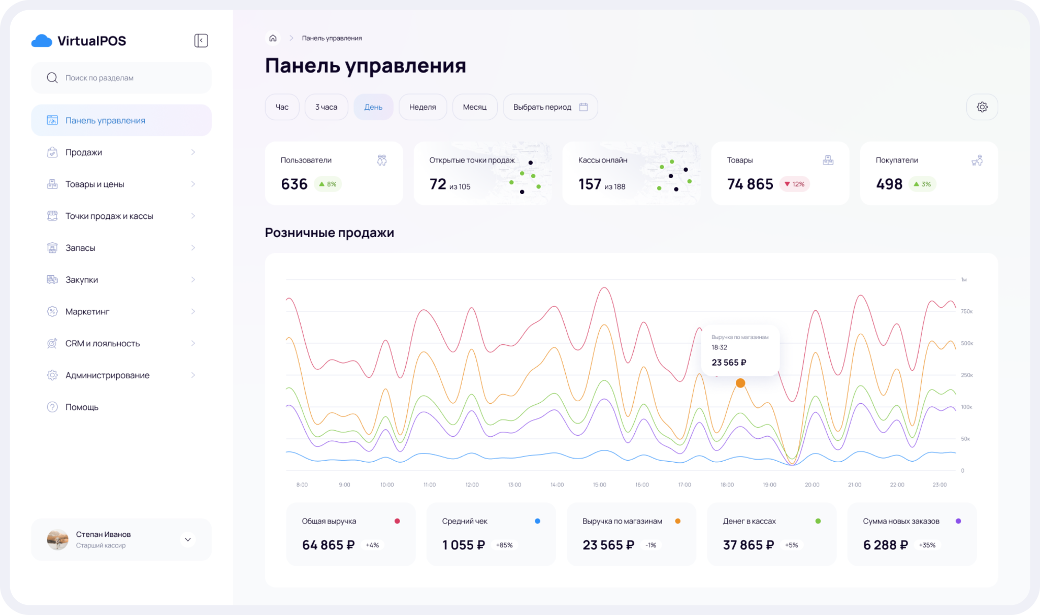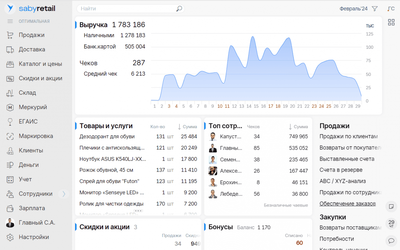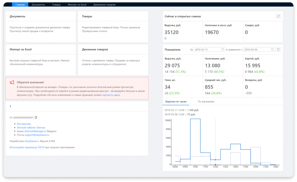 - На отдельный дашборд вынесены отчёты по финансовым показателям за смену: выручка, возвраты, скидки, средний чек.
