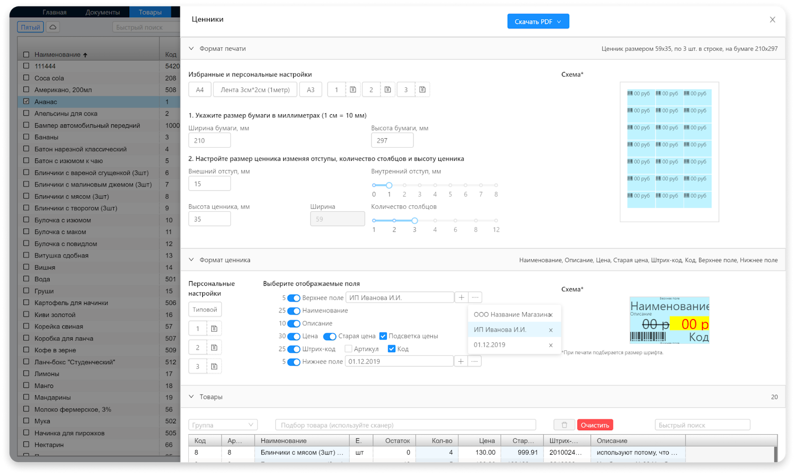 , возможно, лучшая программа складского учёта. Она помогает найти ошибки, например, просроченный товар или отрицательные остатки. В приложении получается быстро заводить карточки товаров: из накладных в Excel, с помощью сканера или создания группы товаров. Через 10–15 минут данные об остатках обновятся. После продажи остатки также будут автоматически пересчитываться, на складе не будет путаницы. А сразу после приёмки вы можете прямо в программе сделать ценники на товары с актуальными ценами — вот так выглядит конструктор ценников в системе.