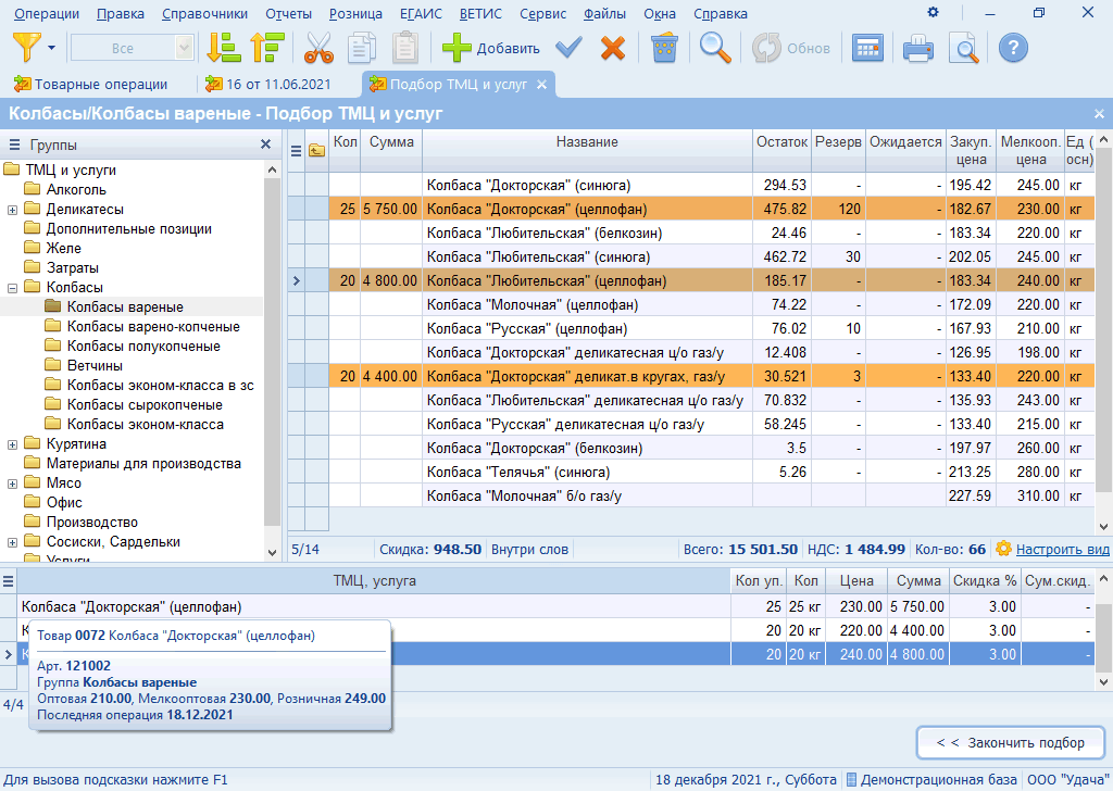 - Разукомплектация товаров: головку сыра или мясную тушку можно разделить на составные части. Продукт будет списан в учёте и оприходован как обычный товар.