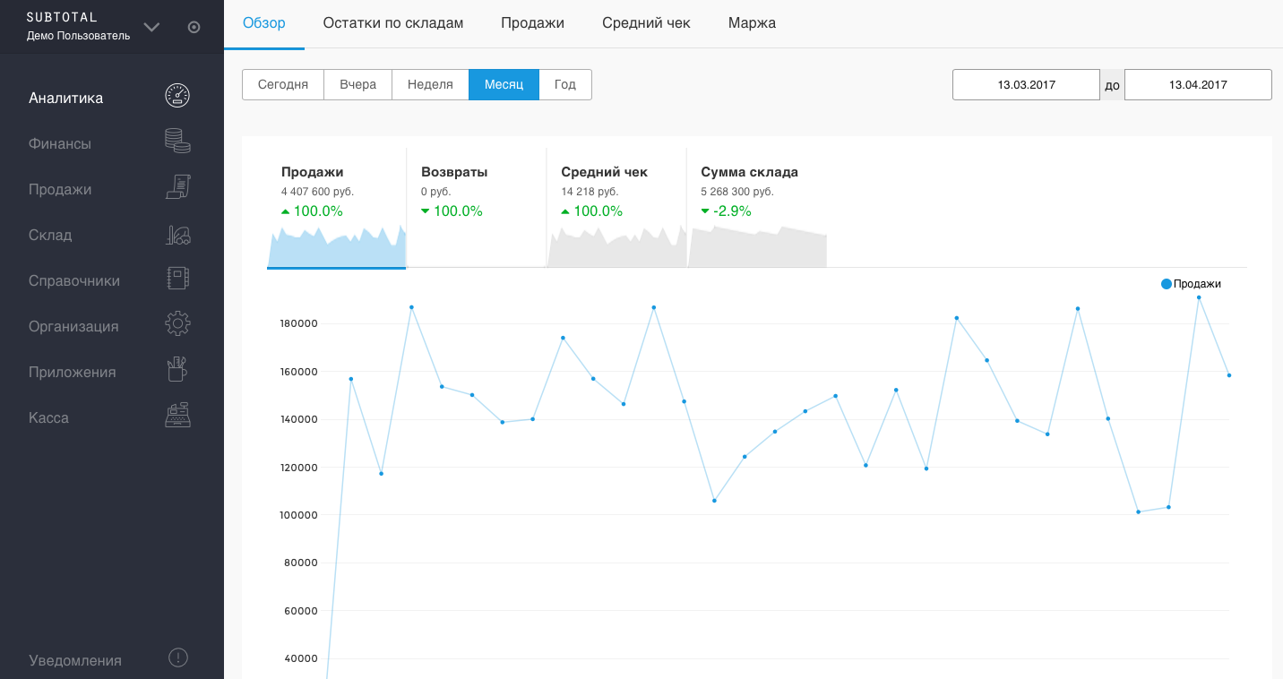 - Легко отслеживает продажи, выручку, спрос.