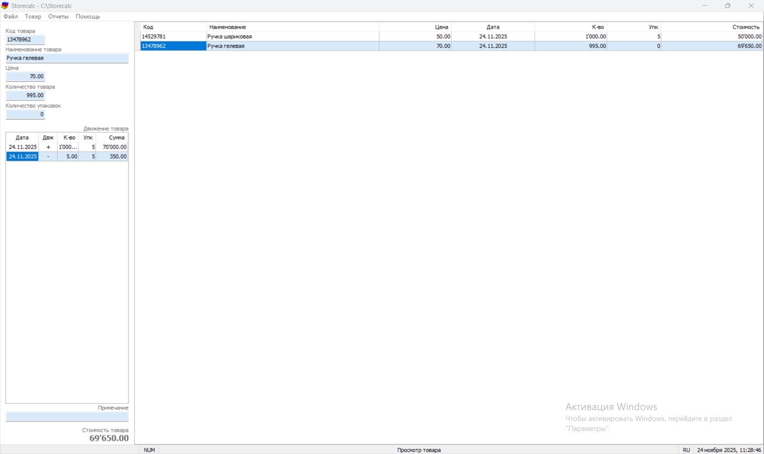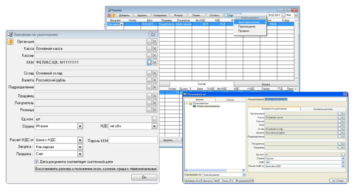 - Перемещения — если товар берут со склада на магазин, программа автоматически меняет остатки.