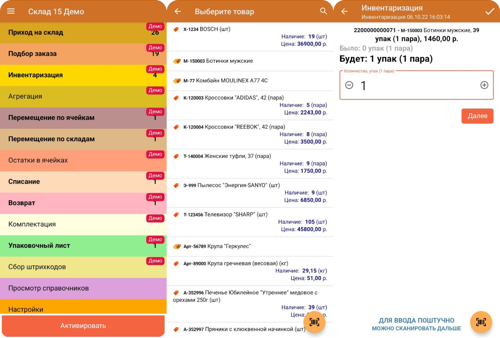 - Доступна инвентаризация всего склада или отдельных товаров.