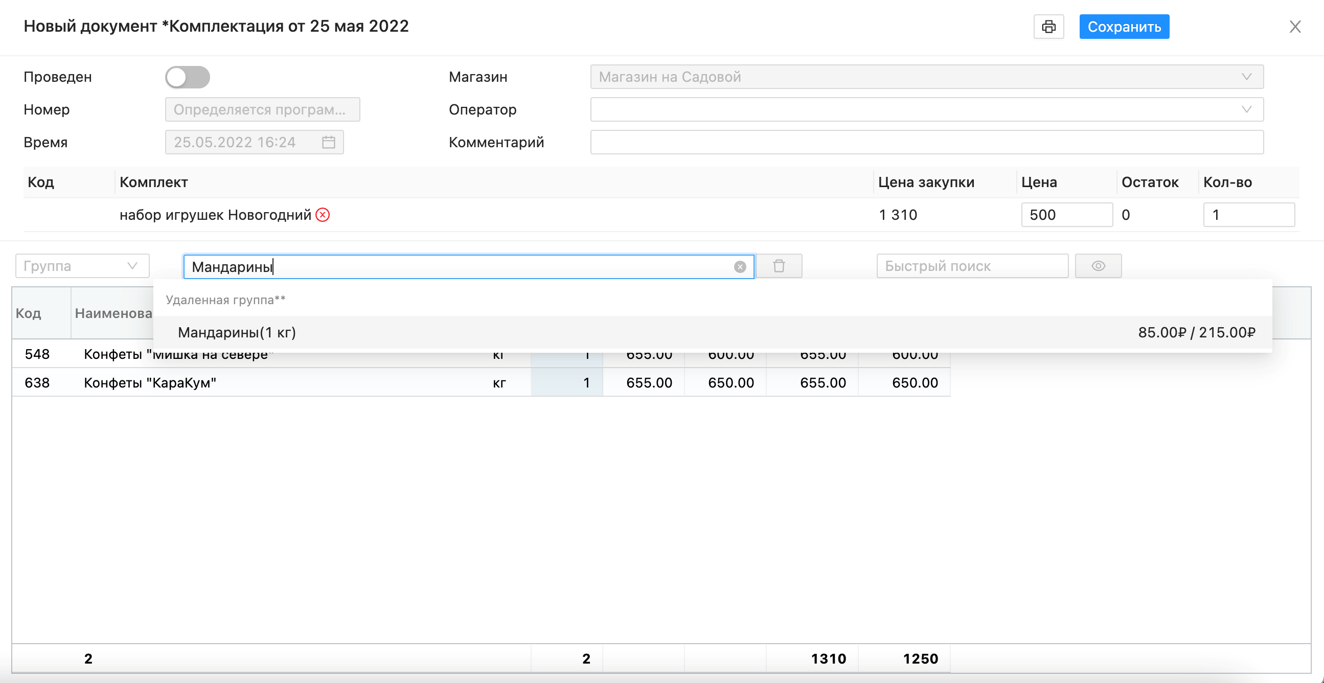 - Из отдельных позиций можно собрать комплект, например, подарочный набор из нескольких косметических средств. Товары автоматически спишутся с остатков и оприходуются в комплект. А если наборы не распродадутся, их будет легко разукомплектовать.