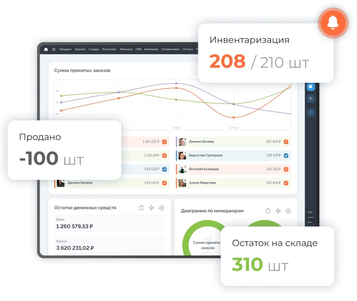 Пересортица, недостачи, отсутствие ходовых товаров — такие проблемы часто появляются, если вести учёт товаров вручную или использовать Excel. Программа складского учёта уменьшает количество подобных ошибок. Она автоматически пересчитывает остатки при продажах и поступлениях, прогнозирует спрос и просчитывает сколько чего дозаказать, помогает провести инвентаризацию.