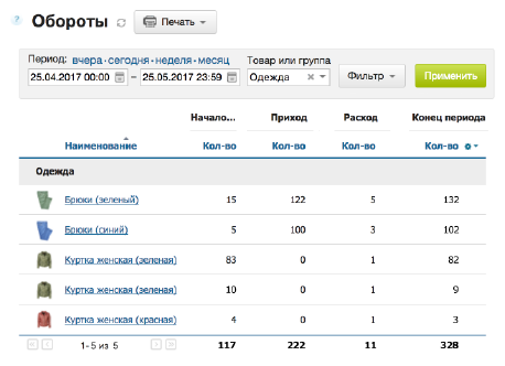 - Контроль приёмки, перемещений по складам, возвратов, продаж.